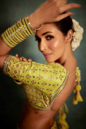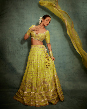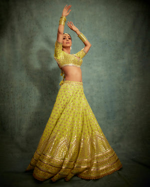 This stunning lime lehenga in rich tassar ,emblished with gold and silver gota and exquisite zardosi work butties,it reflects the geometry and design of idia's amazing forts and havelis. In all the vivid hues and festive silhouettes