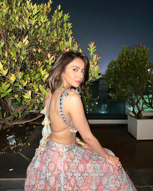 This gorgeous coordinate print lehenga brings to life the variations, textures, tonality and patterns of stone and painted tiles. Delicate gold embroidery lifts the patterns and add texture and shimmer. The halter choli, embellished with mirrors and tassels adds a boho vibe. The soft organza embroidered dupatta completes this Ensemble.