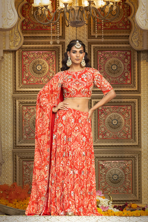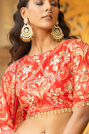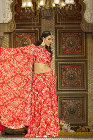 Crafted in fluid georgette and drenched in a joyful red print, this lehenga set is a celebration of stories untold—a blouse, lehenga, and dupatta ensemble, brought to life with all-over hand-embroidered mirror work that dances with every light it catches. Designed for the bride who’s not afraid to sparkle a little louder, this look twirls with movement, mischief, and memories—ready for sangeet nights, stolen glances, and laughter that refuses to stay quiet.