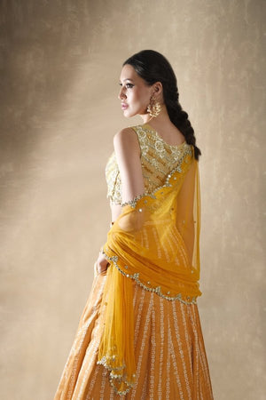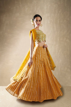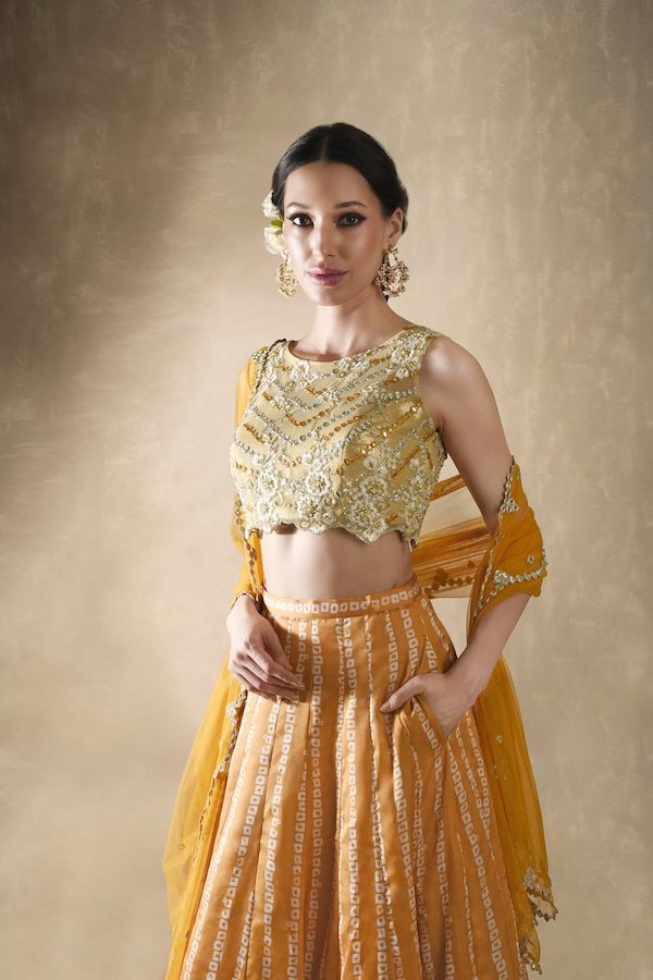 This Set Features A Mango Bandhani Lehenga Set. A Kalidar Bandhani Lehenga Is Teamed With The Classic Renee Label Mirror Work Blouse. The Sheer Net Blouse Is Embellished With Dori, Mirrors, & Beads With Sequin Sheathed Bustier. A Net Dupatta With Mirror Buttis & Scallop Border Completes The Look. Cancan & Pockets Are Included.