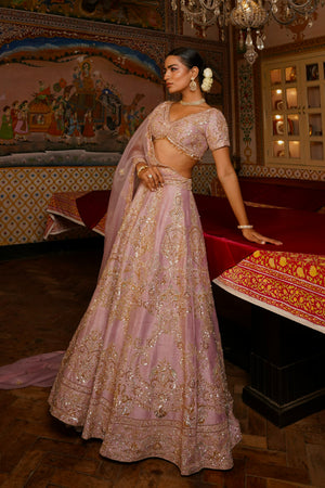 Drape yourself in timeless elegance with this stunning Mauve Pink Lehenga Set, meticulously crafted on pure silk. The lehenga features intricate hand embroidery using cutdana work, adding a subtle colorful shimmer and textural depth to the rich silk fabric. Paired with a beautifully detailed blouse that echoes the same fine craftsmanship, this ensemble is a true statement of refined artistry. Completing the look is an embroidered dupatta, delicately adorned to add a graceful finishing touch. Perfect for weddings, festive occasions, or intimate celebrations, this ensemble blends classic tradition with contemporary sophistication.