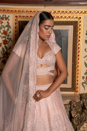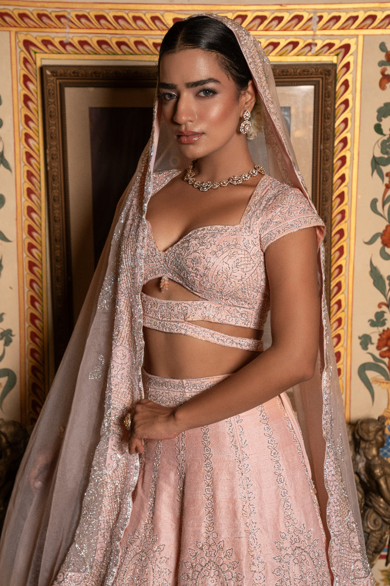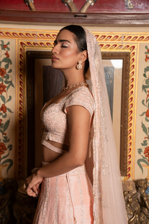 tep into timeless elegance with this exquisite peach hand-embroidered lehenga, a true testament to artisanal craftsmanship. Adorned with intricate zardosi and cut dana embroidery, the lehenga exudes opulence with every detail, capturing the essence of regal sophistication.