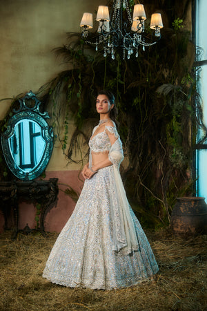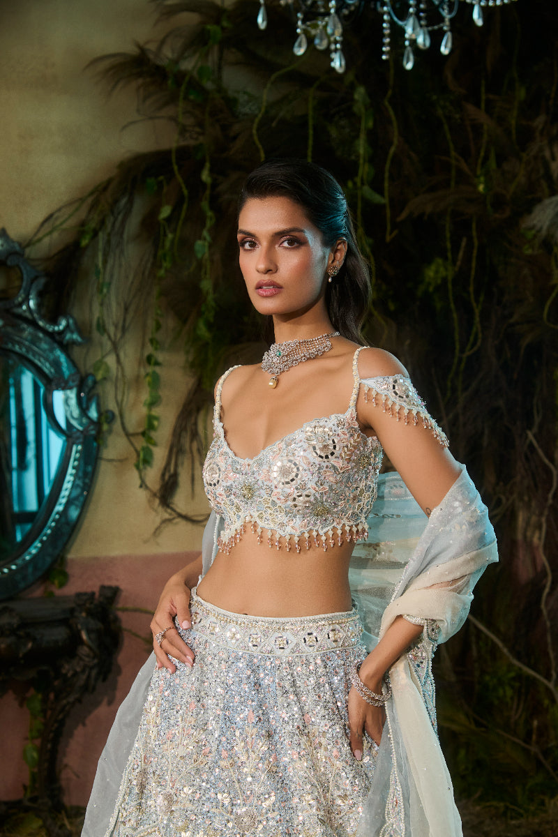 Powder blue embroidered lehenga with cut work blouse and organza dupatta.