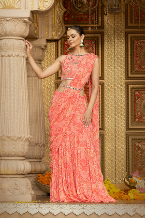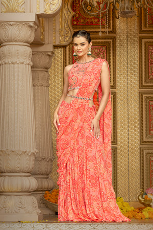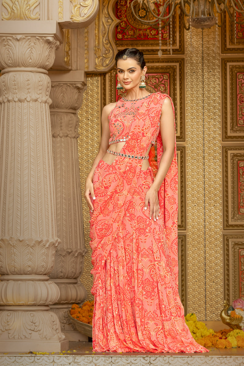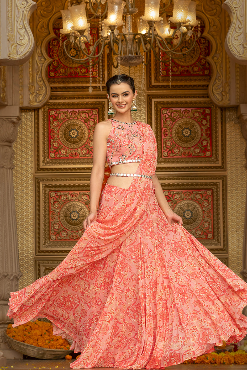 In a romantic rose hue, this printed georgette halter-neck blouse is elevated with all-over hand-embroidered mirror work, catching every glimmer of light like it was made for celebration. Paired with a flowy, coordinated printed georgette lehenga featuring an attached pallu, this ensemble blends boldness with movement—crafted for brides who turn tradition on its head and dance through chaos with grace. Perfect for the ones who thrive in color, sparkle, and the glorious unpredictability of Indian weddings.