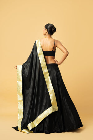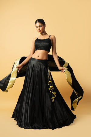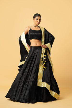 Black Modal Satin Lehenga With Sleeve Less Blouse & Golden Lace In Dupatta And Latkan