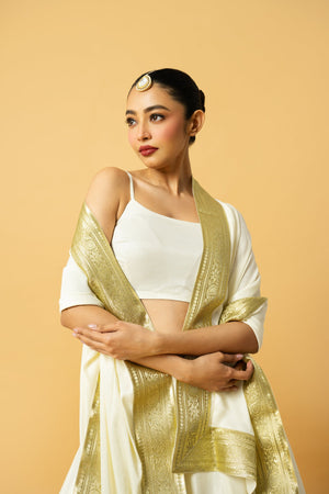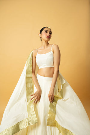 Ivory Modal Satin Lehenga With Sleeve Less Blouse & Golden Lace In Dupatta And Latkan