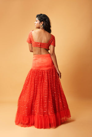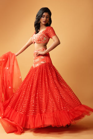 Featuring A Red Coloured Ruffle Lehenga With Sequins Work On Net. The Blouse & Waistline Is Made Of Raw Silk With Pure Handwork Including Kardana, Moti, Embellished Stones And Anchor Thread.