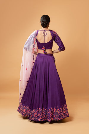 Featuring A Violet Lehenga Made Of Modal Fabric With Intricate Handwork All Over The Blouse, Bottom Of Lehenga And Dupatta. The Handwork Includes Kardana, Moti, Anchor Thread, Embellished Stones, Zari. The Dupatta Is Of A Contrasting Baby Pink Colour.