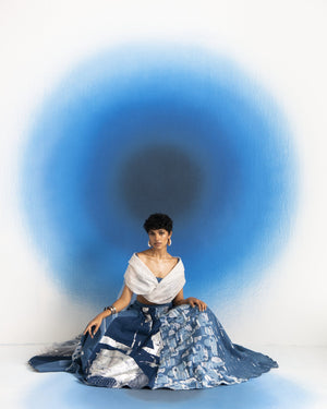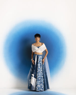 Script overlay,Denim bustier and Denim embroidered lehenga