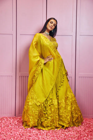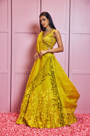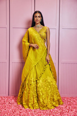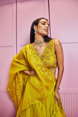 Yellow-Green silk organza floral embellished skirt paired up with hand embellished pearl blouse and organza dupatta
