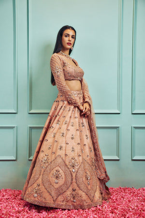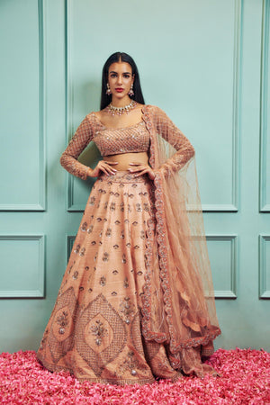 Champagne crystals hand embellished Lehenga in pure raw silk paired up with matching tulle blouse and dupatta.