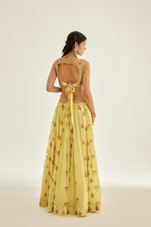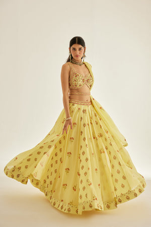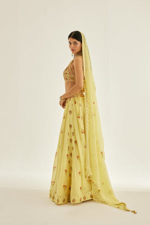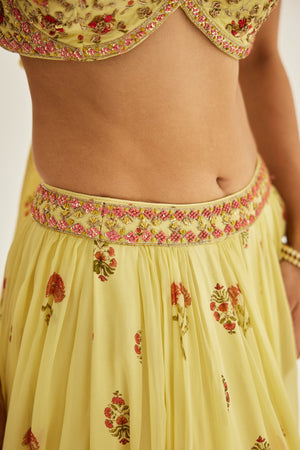 Zardozi embroidered hand block printed blouse and dupatta with chiffon multi panelled lehenga.