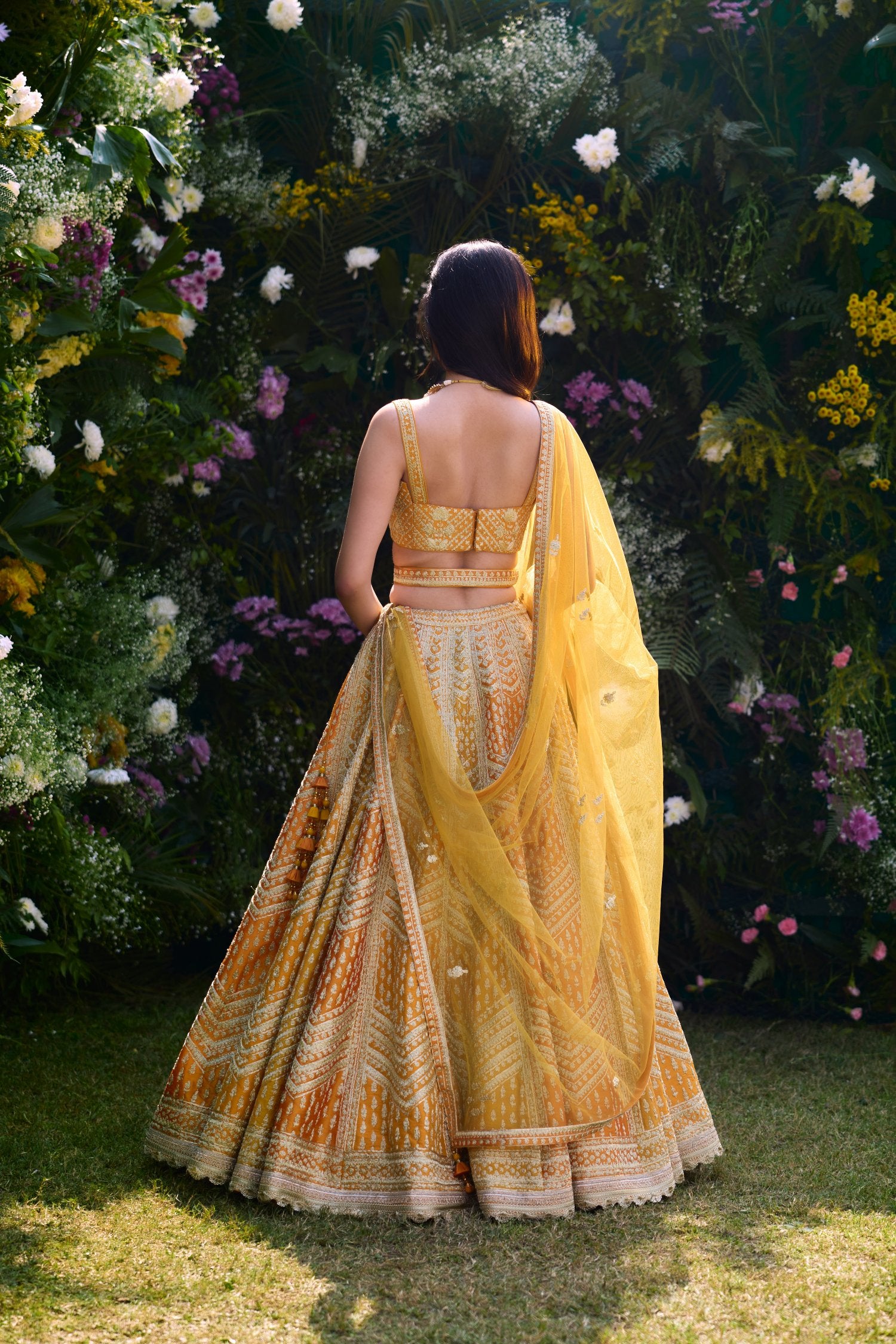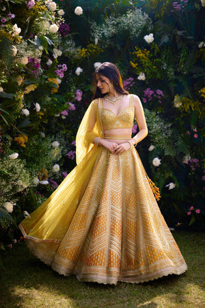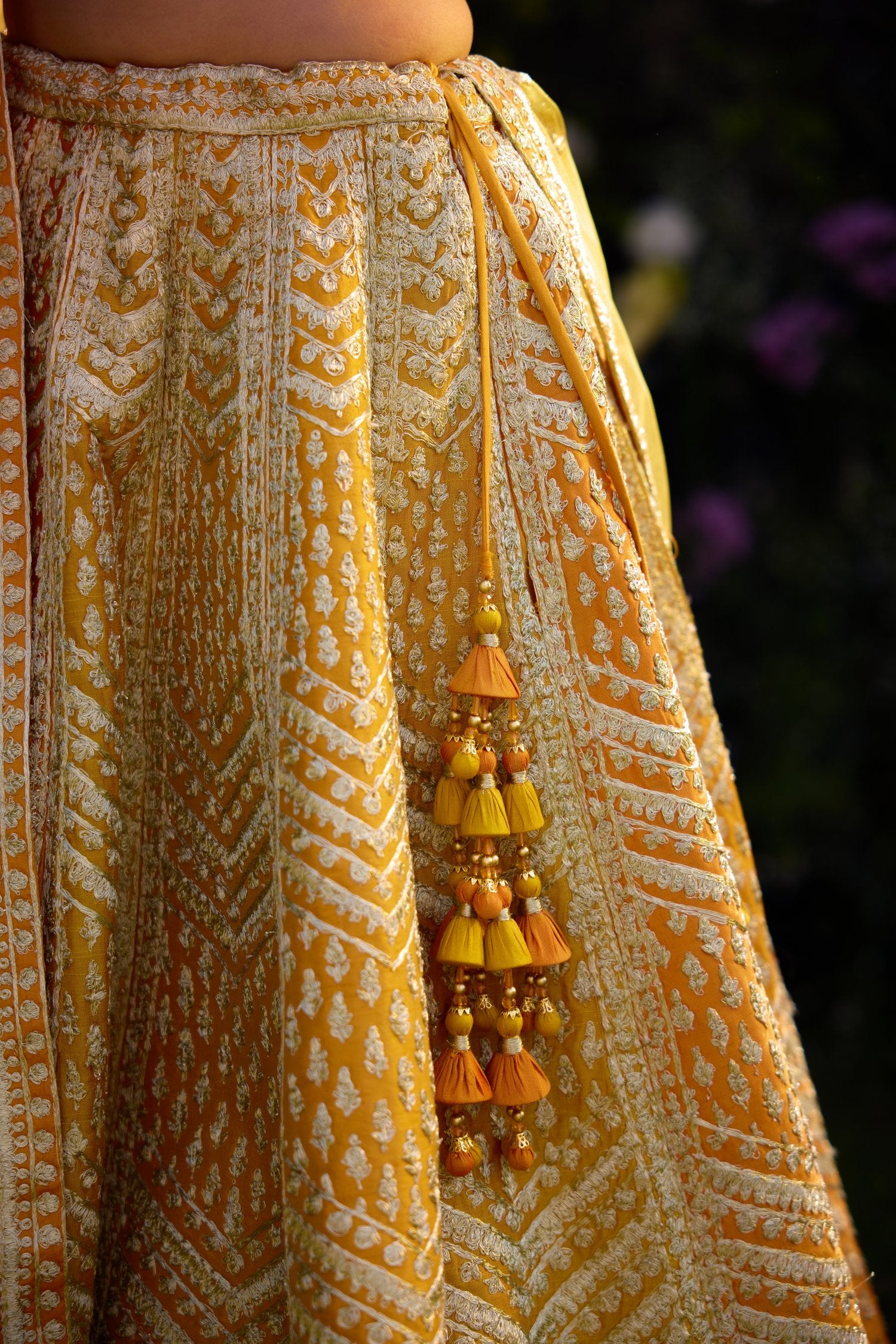 Apricot yellow Raw silk zari dori embroidered lehenga set with net dupatta