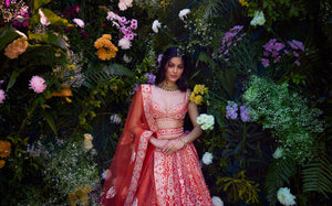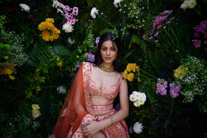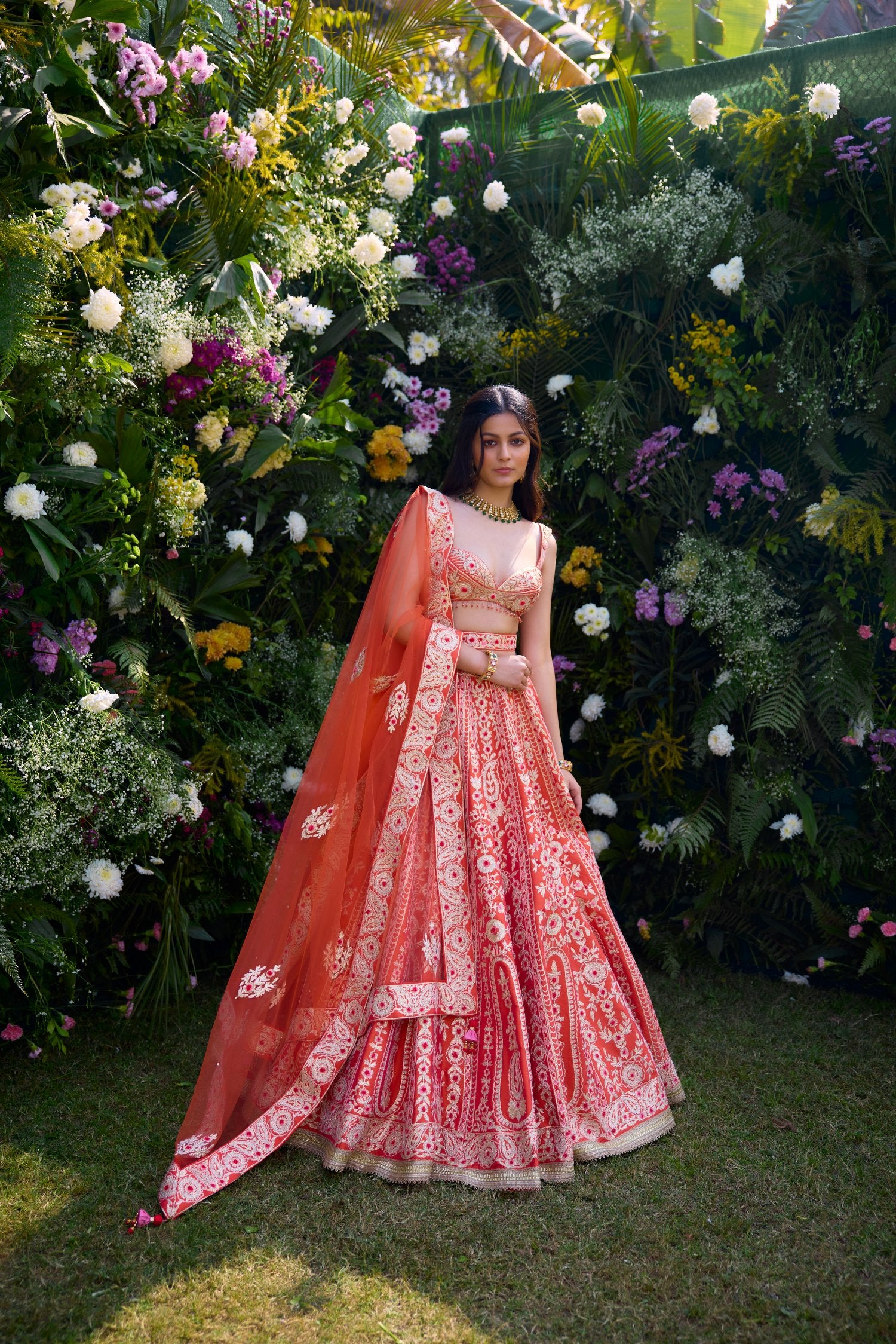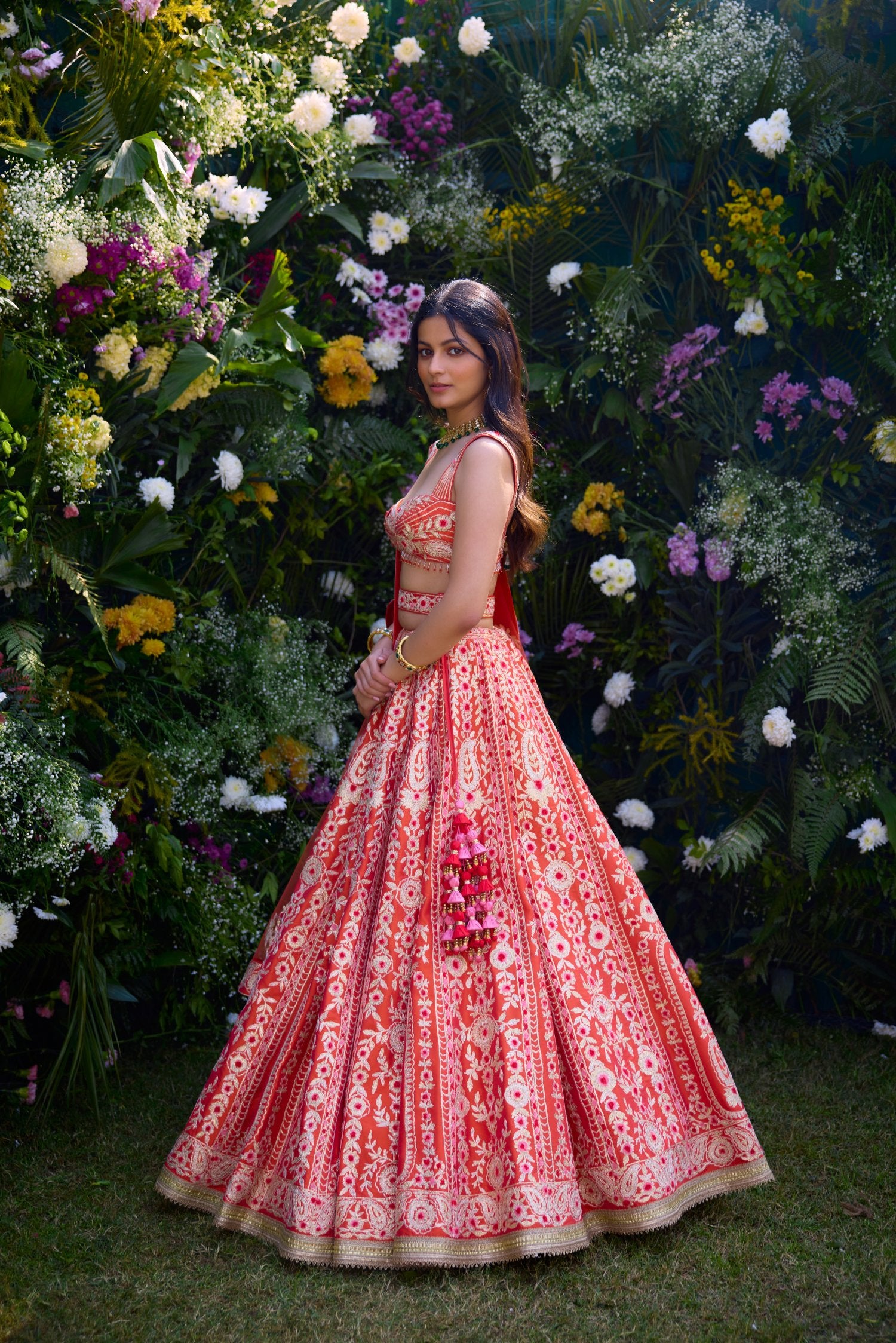 Vermillion Orange Raw silk gota and thread embroidered lehenga with net dupatta