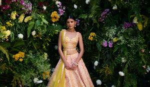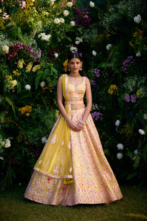 Spectra Yellow gota and thread embroidered lehenga with net dupatta