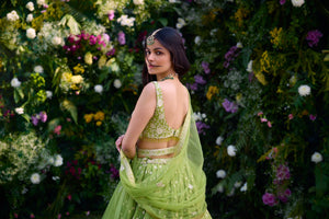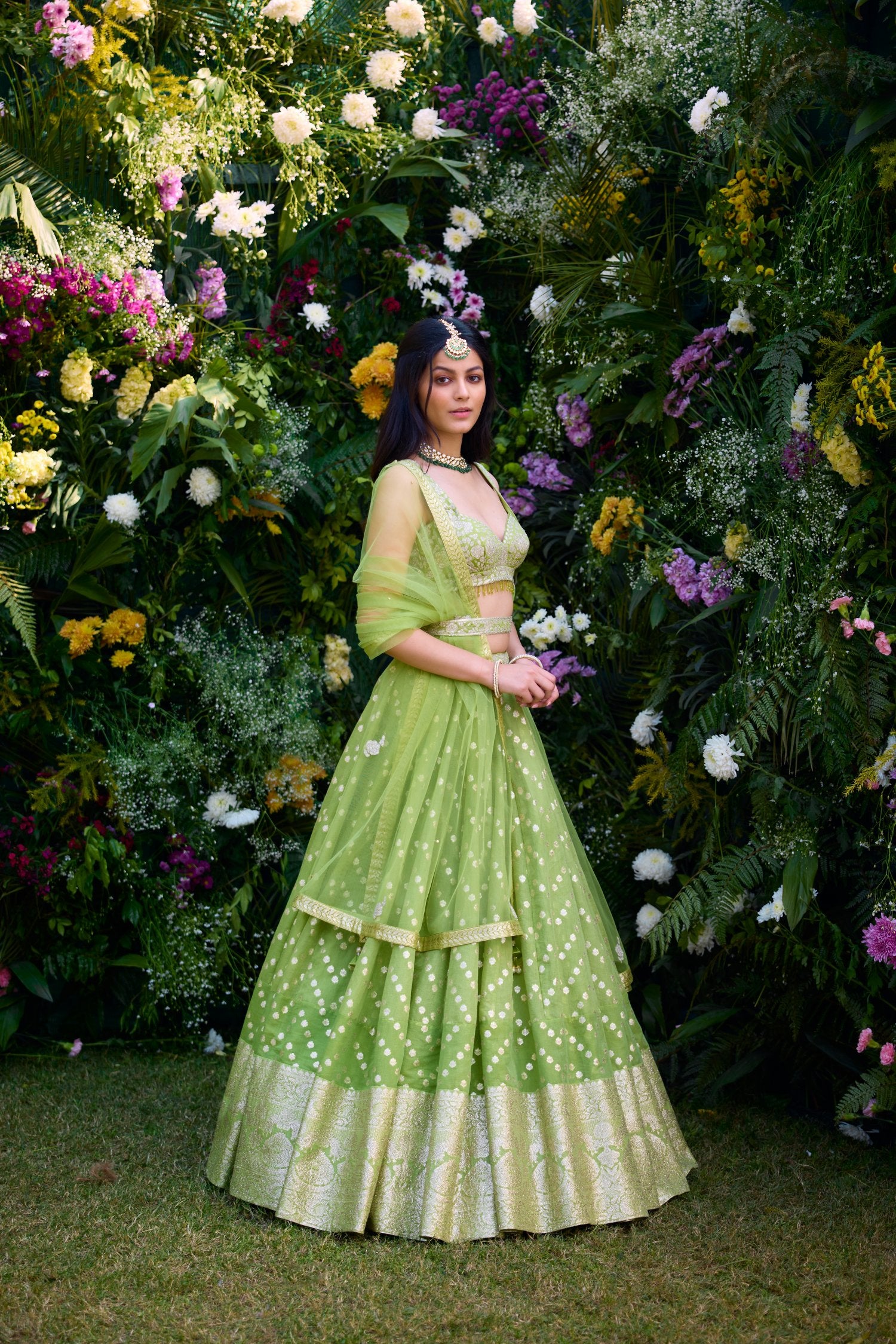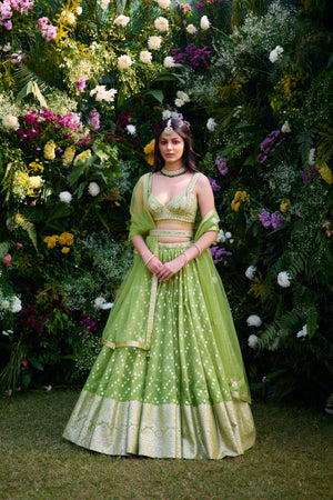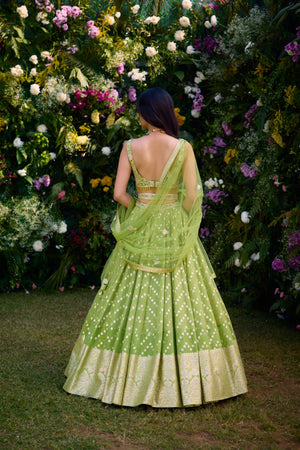 Irish green lurex patch and thread embroidered chanderi jaquard lehenga with organza dupatta