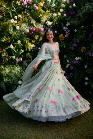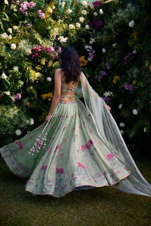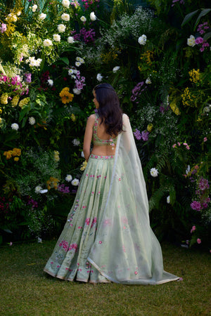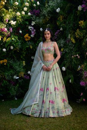 Smoke green block printed zardozi embroidered lehenga with organza dupatta