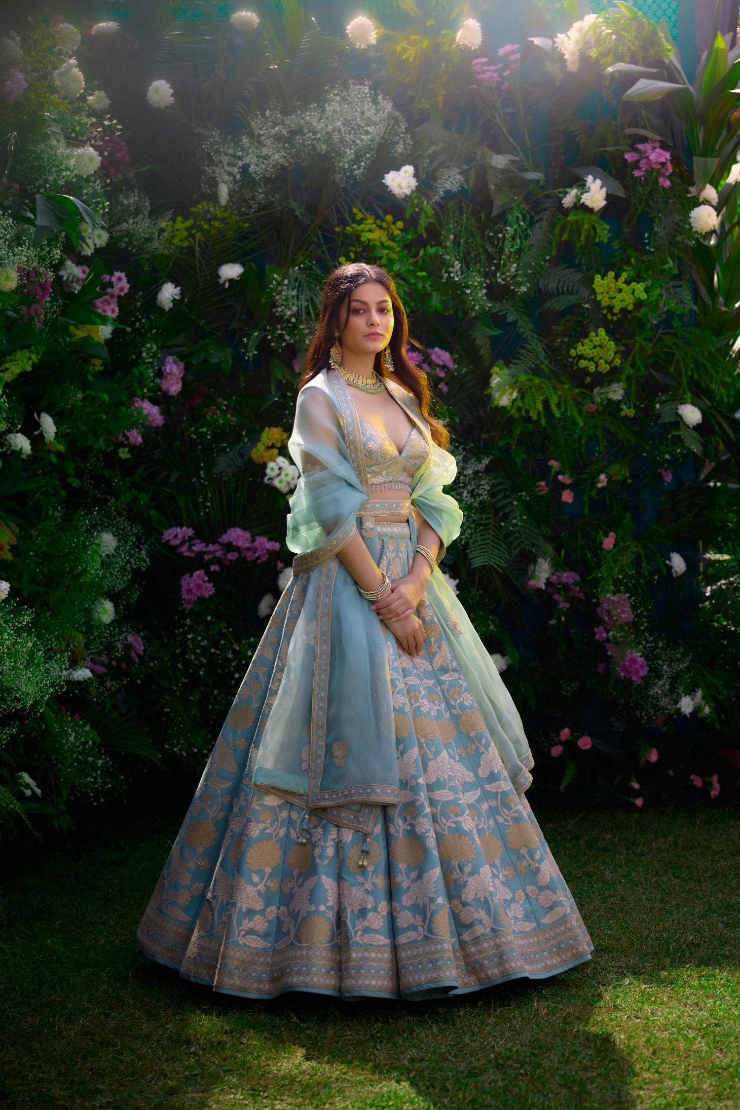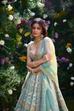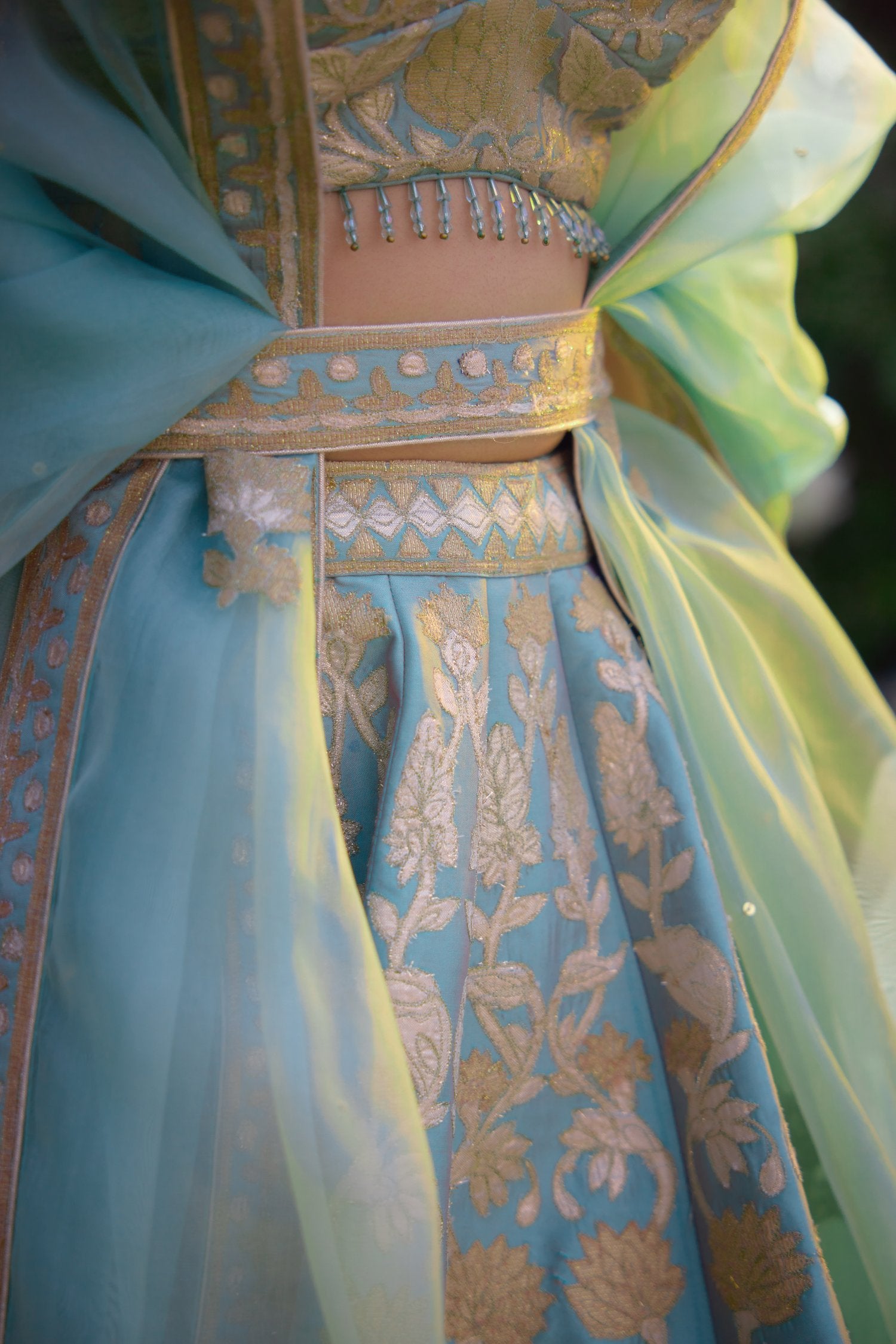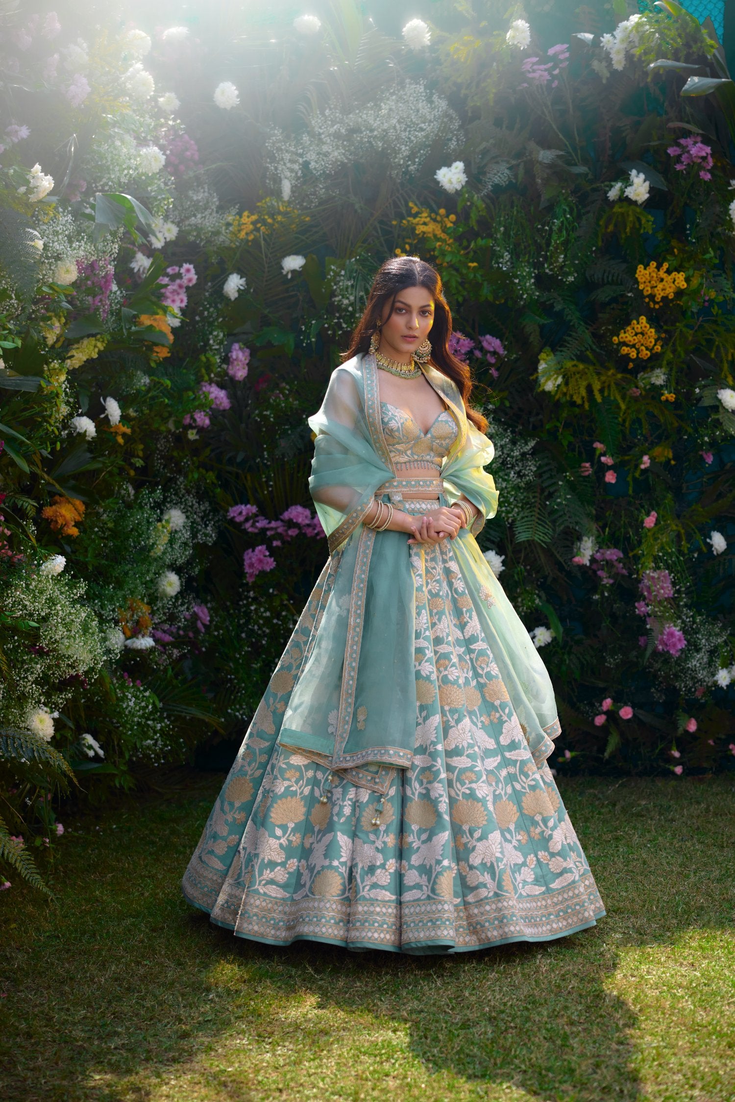 Spray green lurex patch and thread embroidered lehenga with organza dupatta