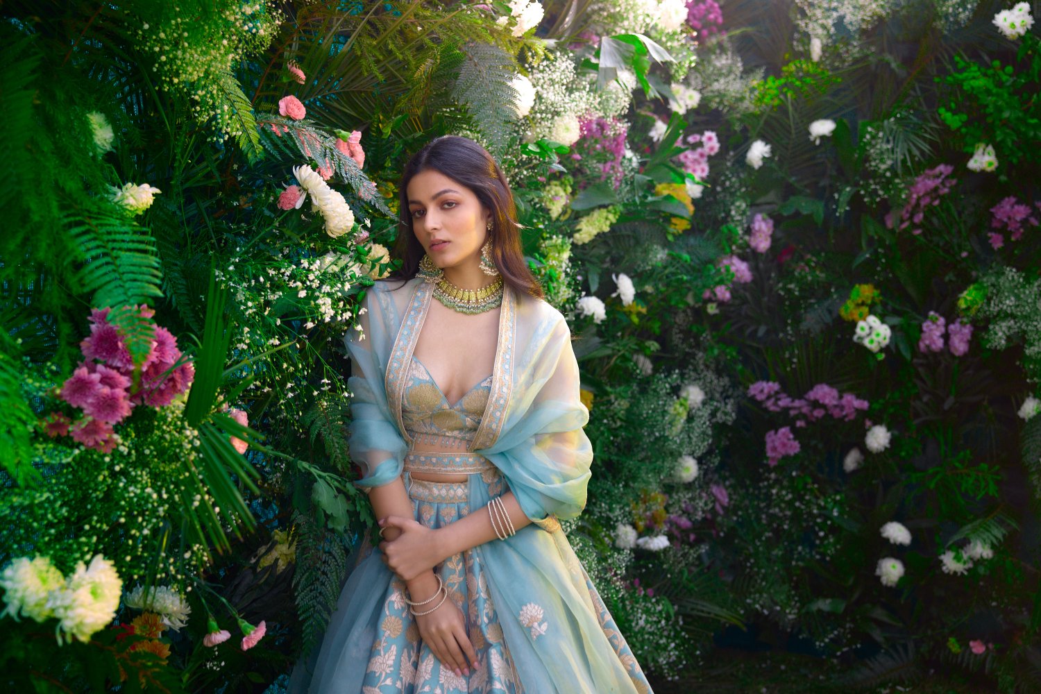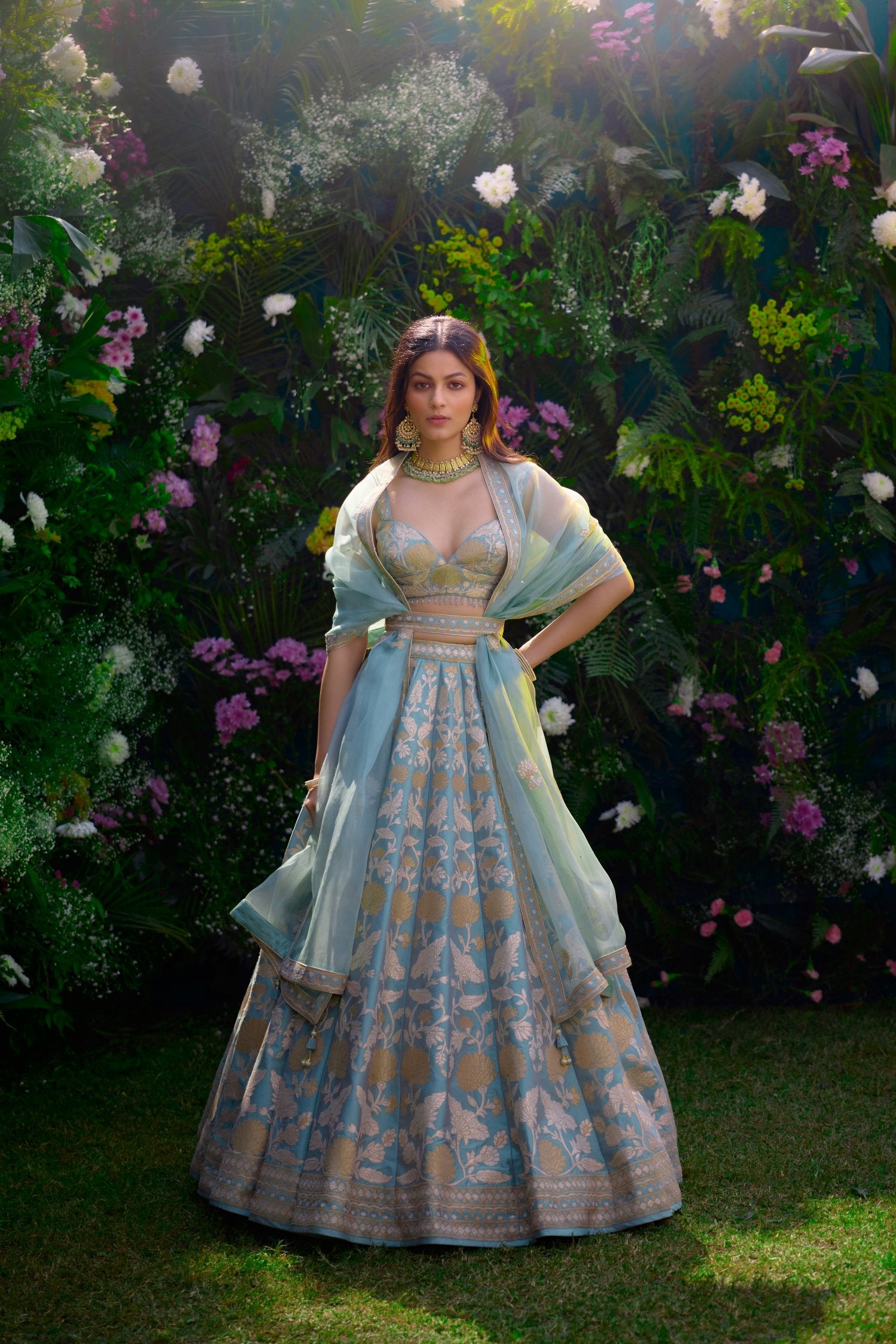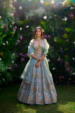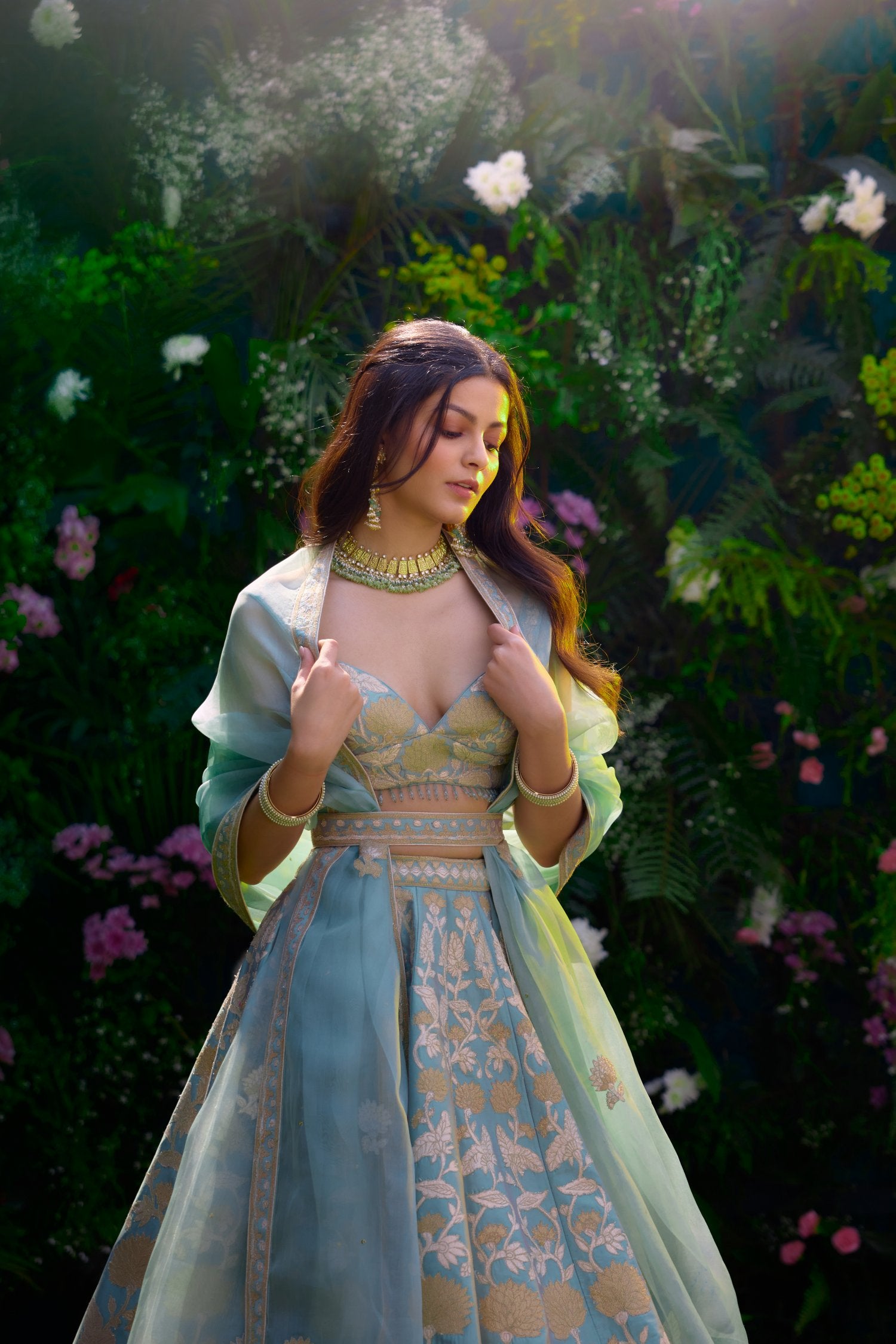 Spray green lurex patch and thread embroidered lehenga with organza dupatta