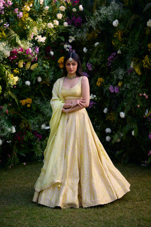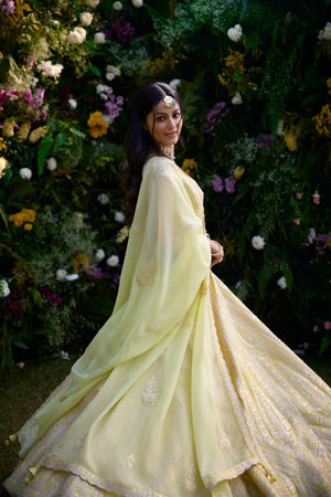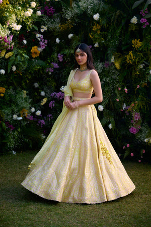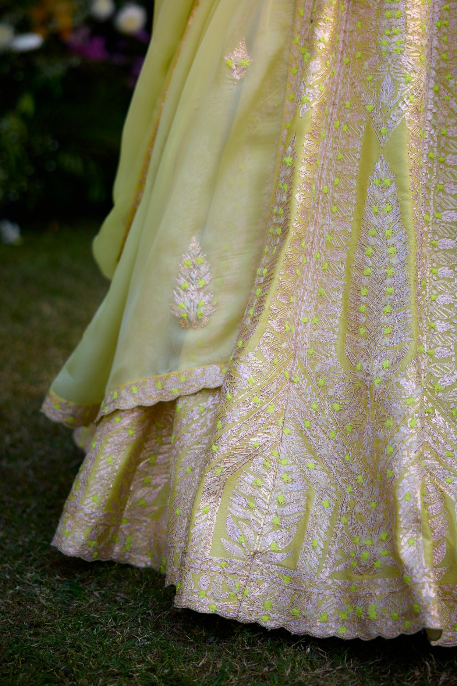 Sunshine yellow gota and thread embroidered lehenga with organza dupatta