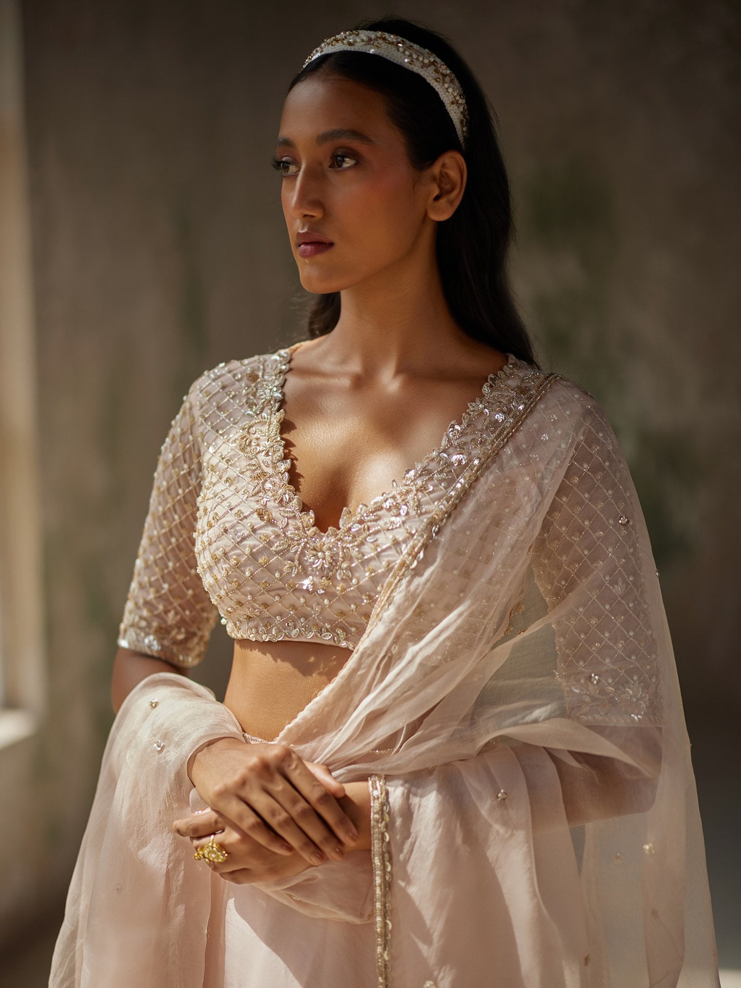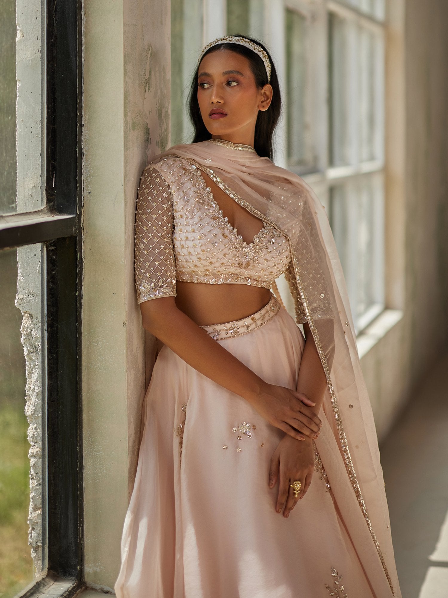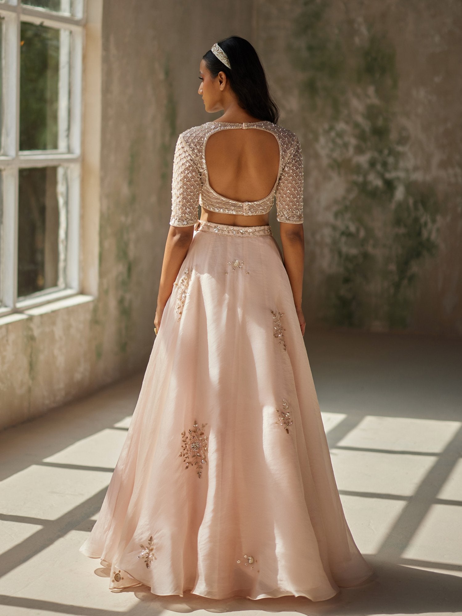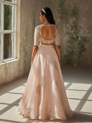 Featuring a champagne pink colour skirt in pure satin silk organza base with heavy aari hand-embroidery. It is paired with matching blouse with intricate aari hand-embroidery.Comes with pure silk organza dupatta with hand-embroidered border all around.