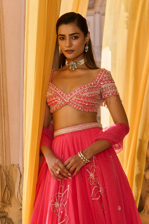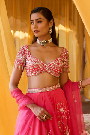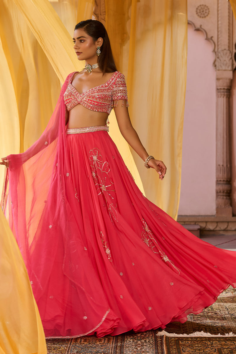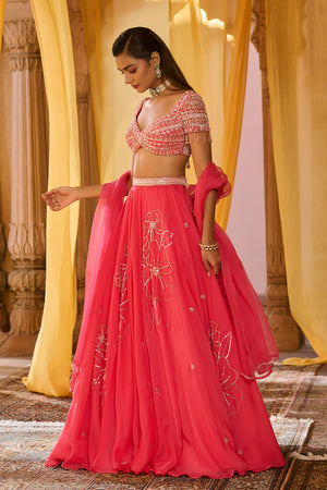 Featuring a soft coral pink double circle lehenga in organza with delicate hand-embroidered floral motif. It is paired with a matching coral pink blouse in net with all over hand-embroidery. It comes with a organza dupatta, with all-over hand embroidered motifs and border . Skirt length: 46 inches