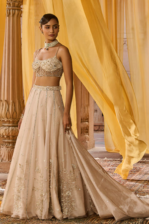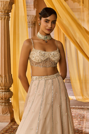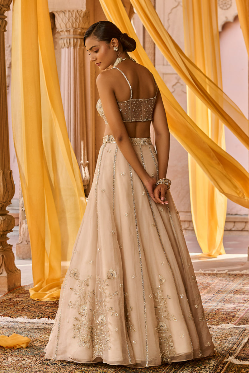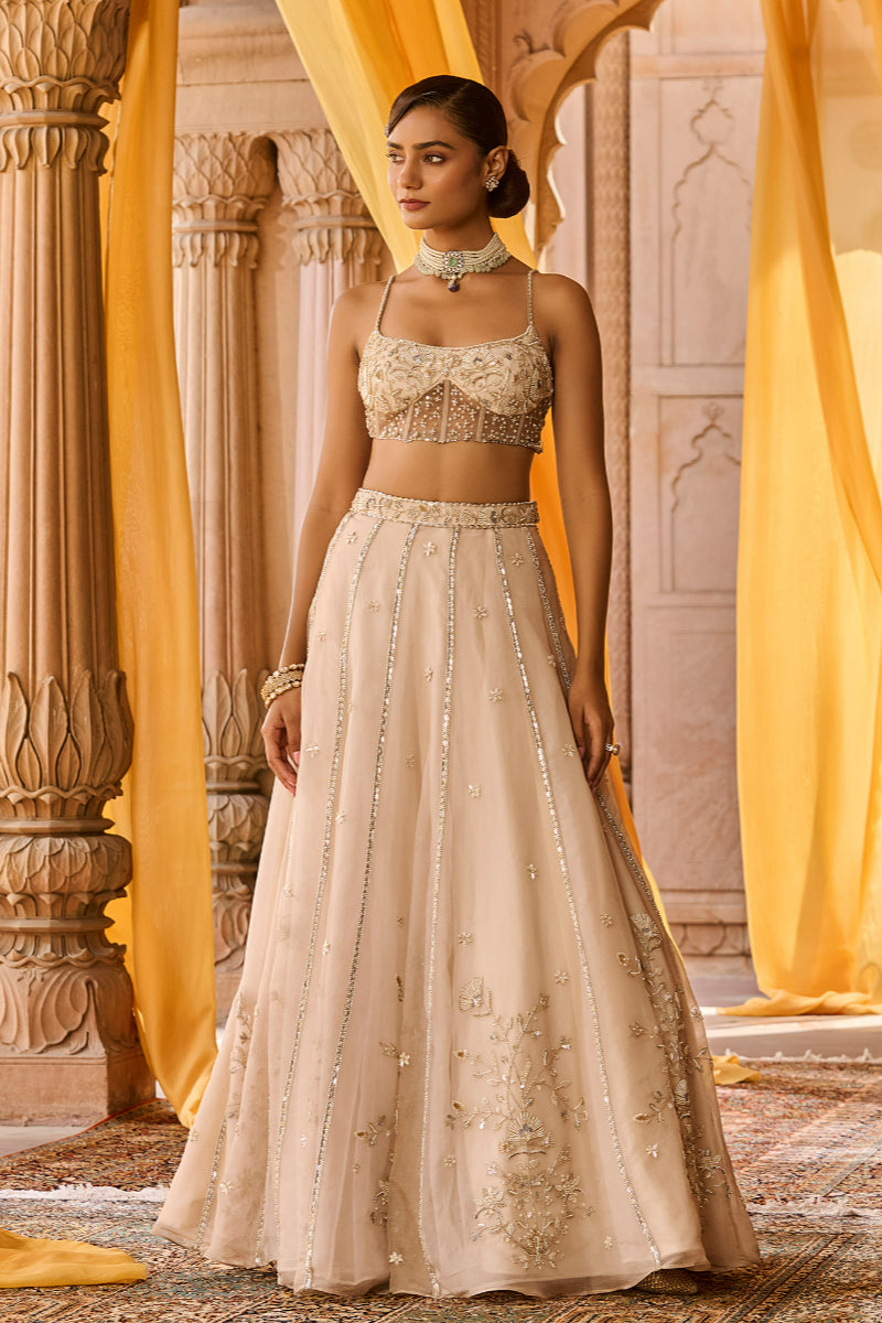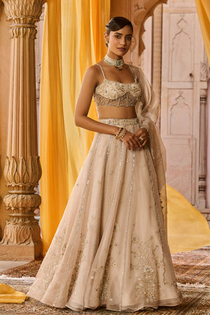 Featuring a ash color pure silk organza lehenga in kalis/panels with intricate hand embroidery on the lehenga, paired with a detailed hand embroidered corset blouse in net. It is paired with a full length dupatta in tissue with a heavy cutwork embroidered border and motifs spread all over . Blouse length: 13.5 inches Front neck depth- 8.5 inches Back neck depth- 9.5 inches