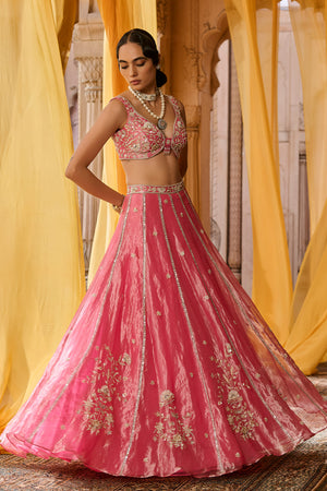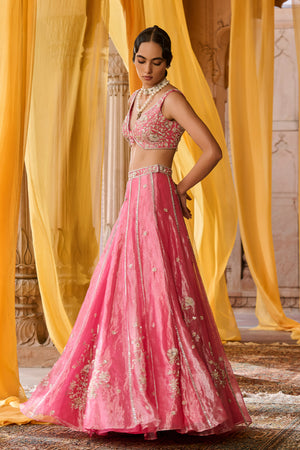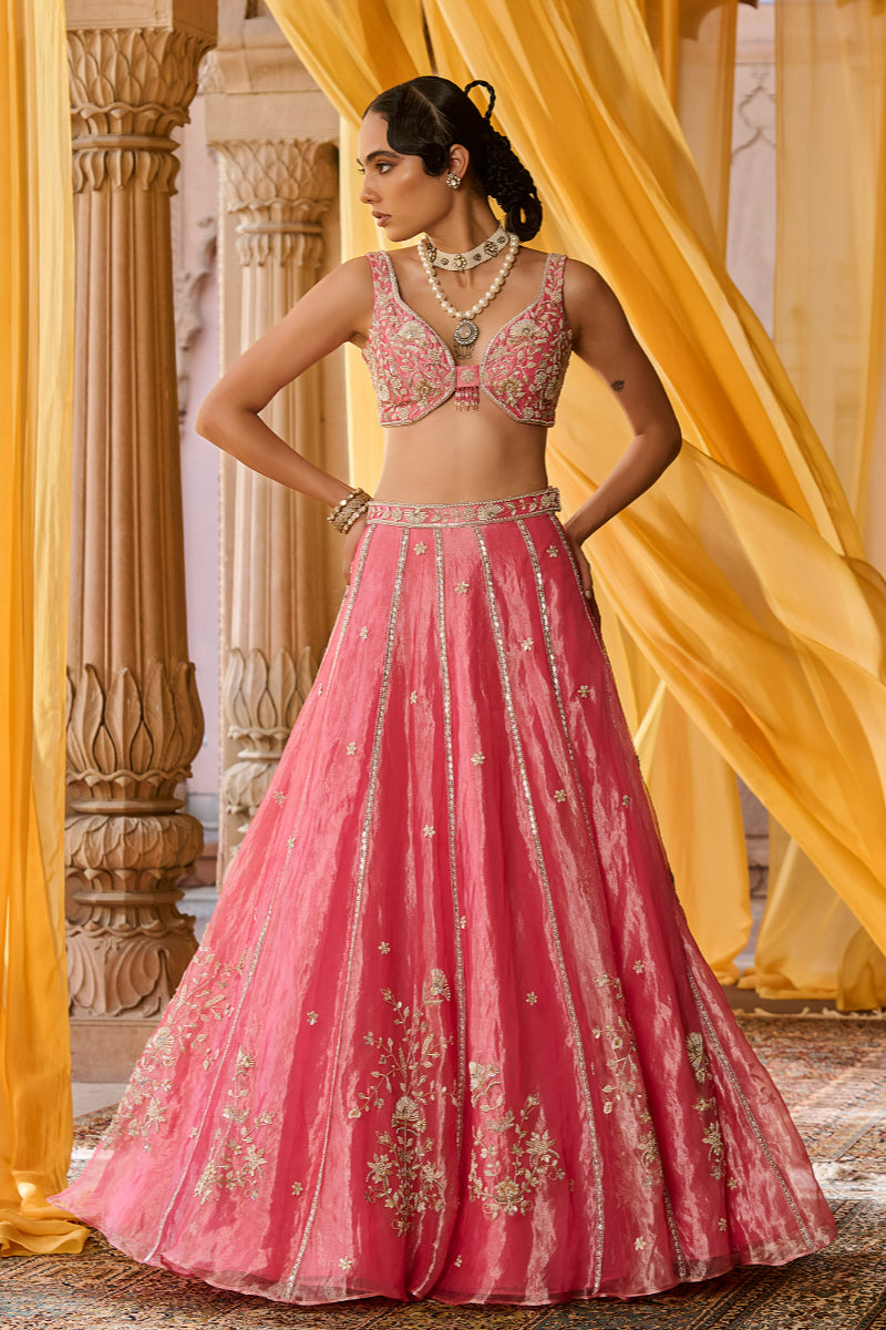 Featuring a dual tone pink lehenga in kalis/panels in Tissue fabric with intricate hand embroidery on the skirt, paired with a matching blouse with intricate aari hand embroidery and tassels in the centre front. It comes with an organza dupatta with hand embroidered border and motifs all over. Skirt length: 45/46 inches
