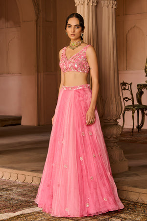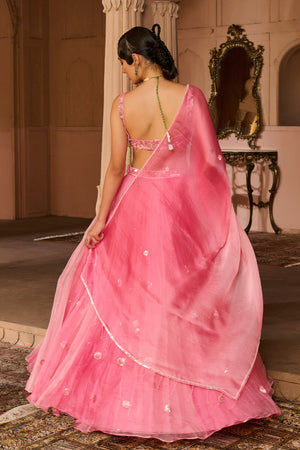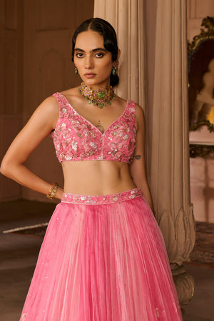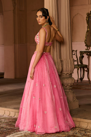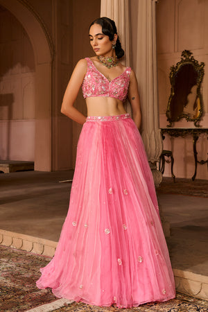 Featuring a ombre pleated organza lehenga set with small hand embroidered floral motifs all over. It is paired with a matching blouse in net with intricate aari hand embroidery. It comes with am ombre satin organza dupatta with hand embroidered border & motifs Skirt length: 46 inches