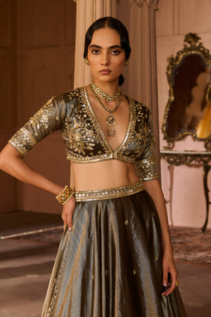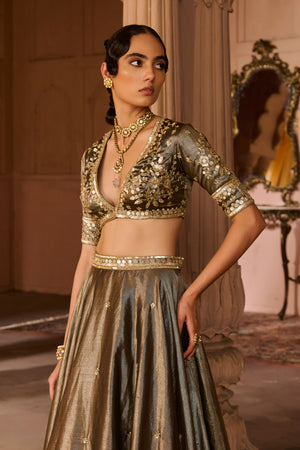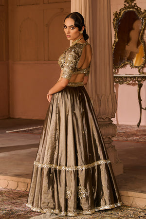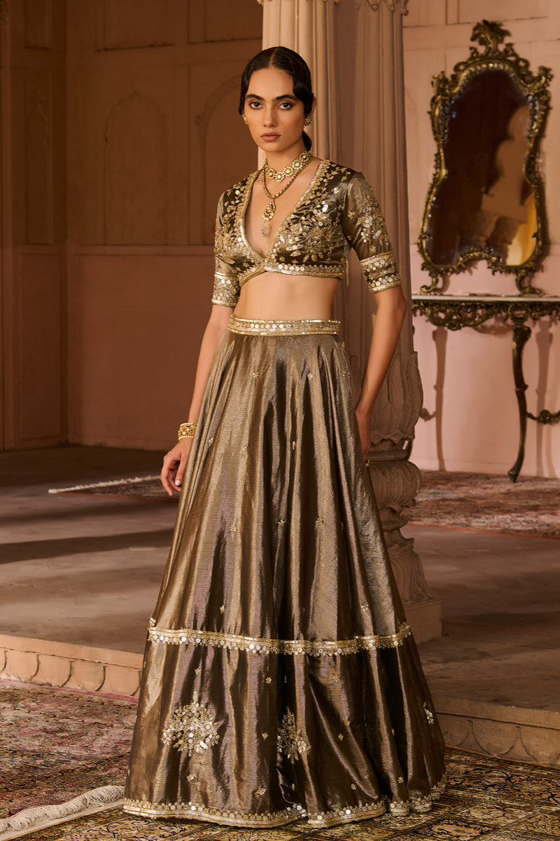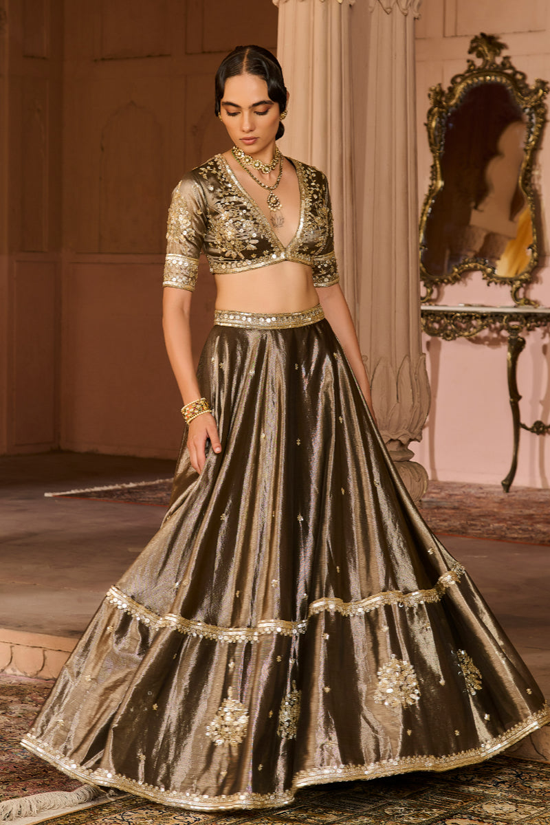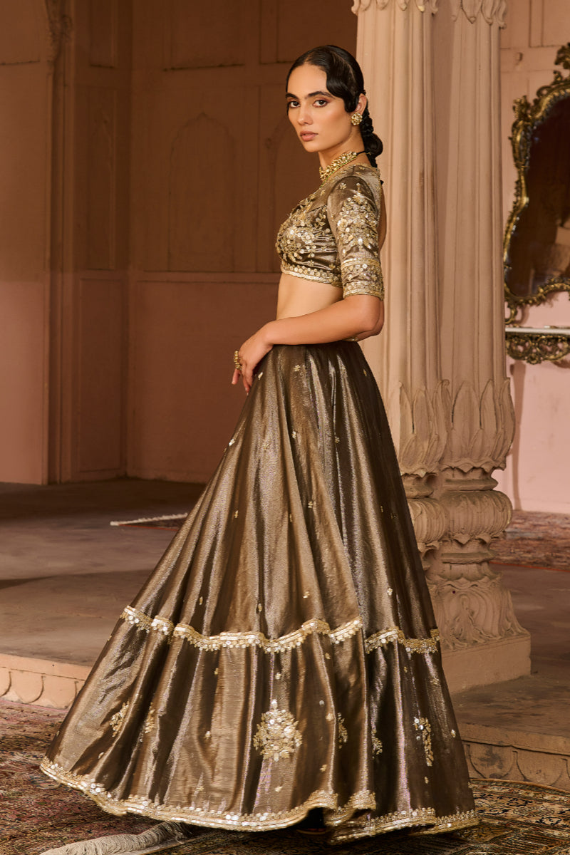 Featuring a copper colour lehenga in tissue in circle, with intricate hand embroidered on border and motifs. It is paired with a matching blouse and a silk organza black dupatta with hand embroidered border and motifs on it , adorned with tassels. Blouse length: 13 inches Front neck depth: 11.5 inches Back Neck depth: Normal Lehenga length: 46 inches Sleeve Length : 11 inches
