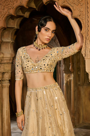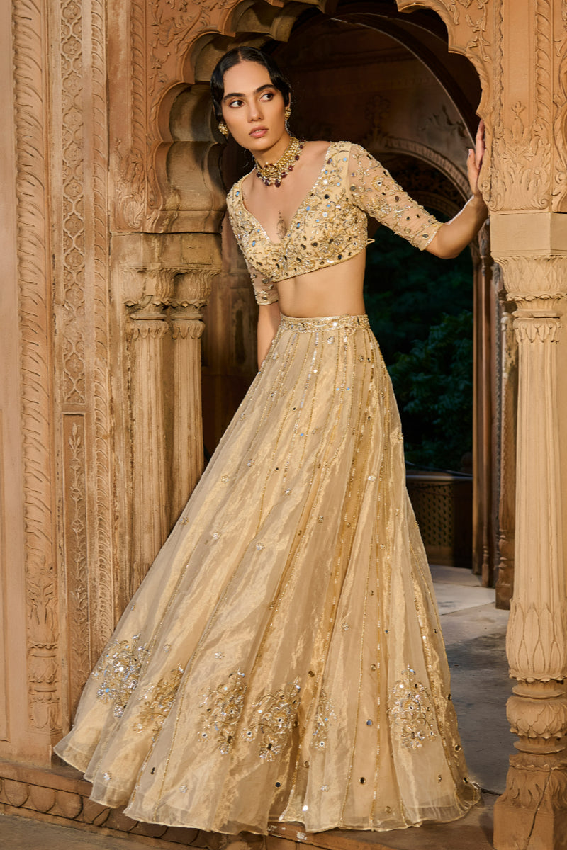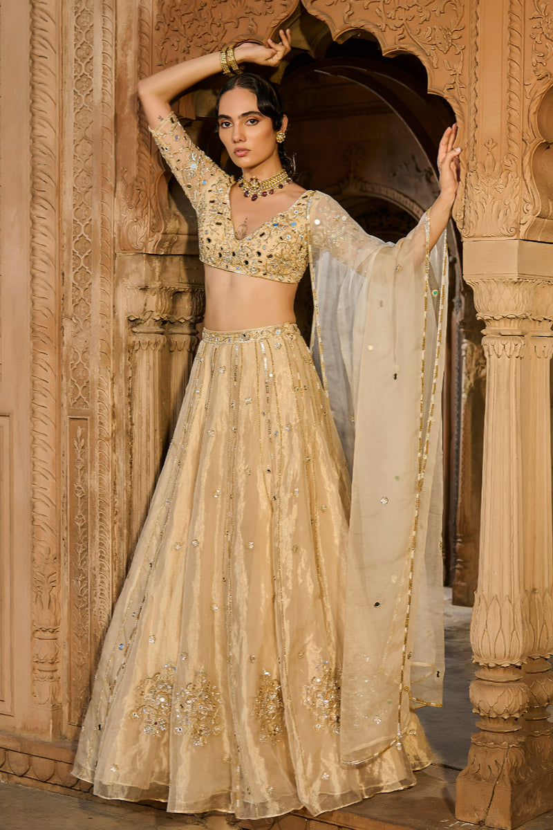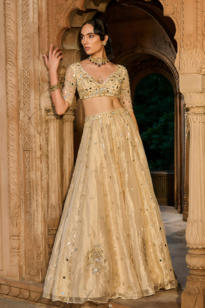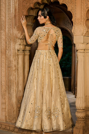 Featuring a gold colour kalidar lehenga in silk tissue with heavy aari hand-embroidered motifs and border lines adorned with mirror work and motifs all over. It is paired with matching blouse in net with intricate aari hand-embroidery. It has an open back with triple layer of drawstrings along with tassels .Comes with an ombre organza dupatta with hand-embroidered border and motifs all over it.