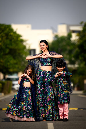 Multicolor jungle print (copyright) lehenga with pink ruching detail at hemline