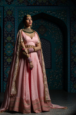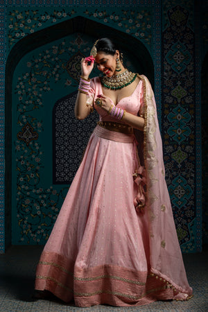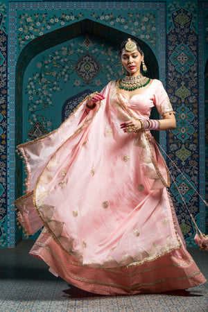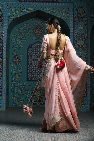 Isn't a lehenga set bride's best friend? Experience the specially handcrafted silk brocade lehenga set featuring a kali lehenga with heavy gota embroidery border paired with a blouse adorned with gota details along the sleeves and waist. Handcrafted set comes with soft organza dupatta, beautifully embroidered with gota patterns on hems and all over, finished with cascading gota tassels, adding movement and grace to the ensemble. Lehenga skirt comes with an attached cancan for the fuller festive look. This lehenga set blends timeless craftsmanship with modern silhouettes, perfect for your special celebrations. Brides, watch out!