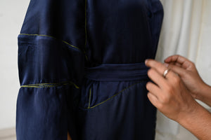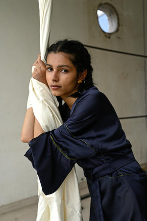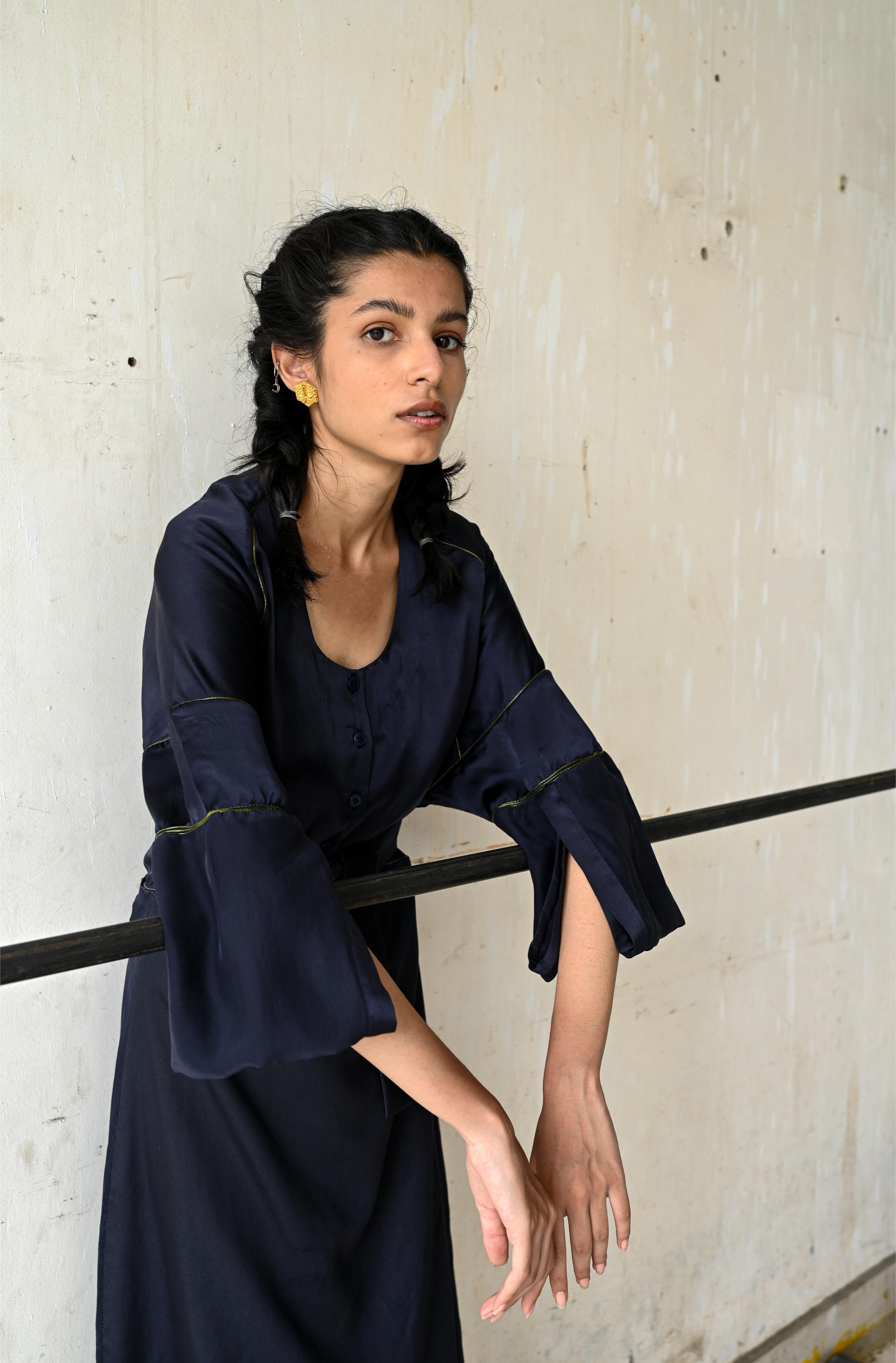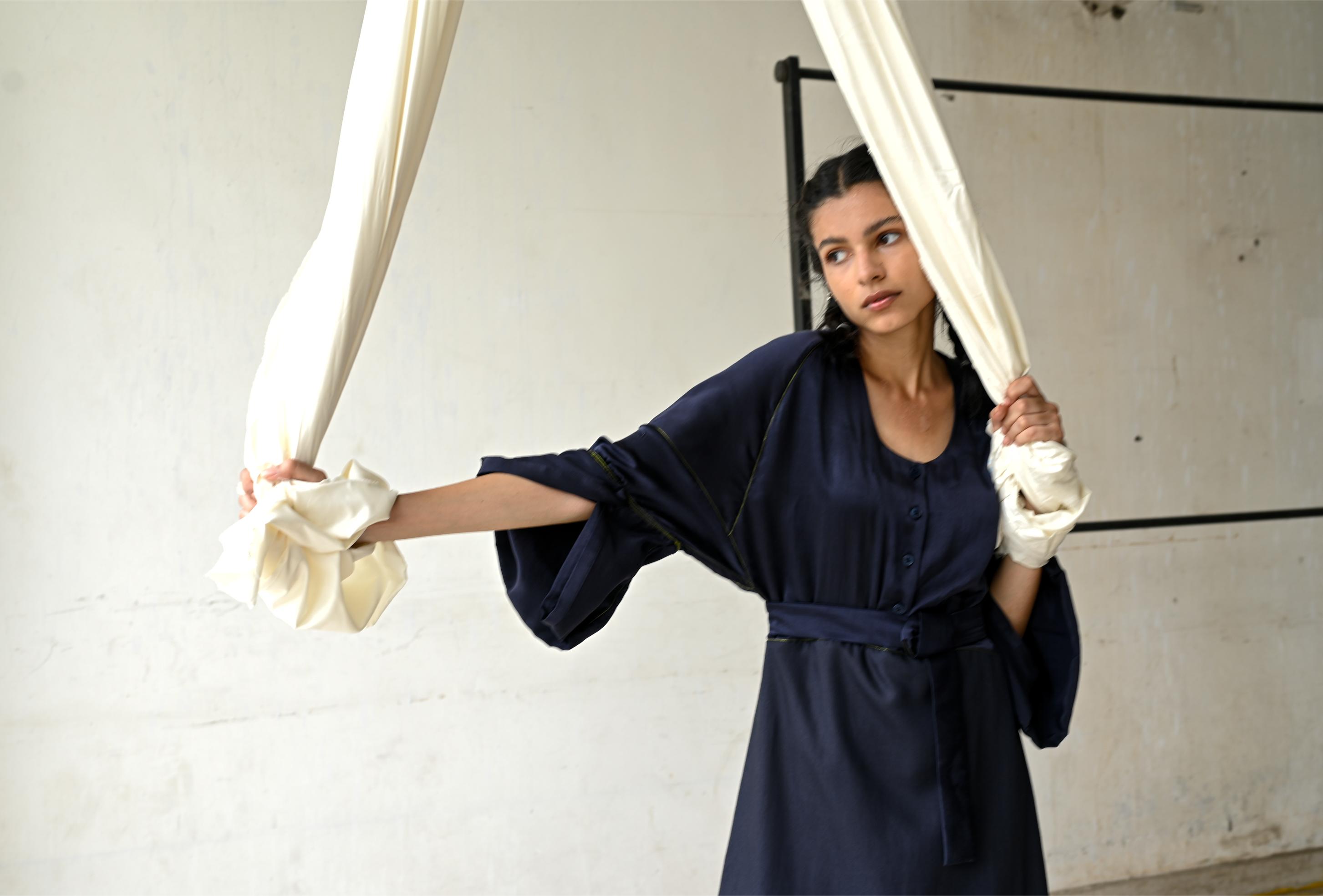 Raglan drop shoulder dress with exagerated cuff, waist belt and PVC seam highlights