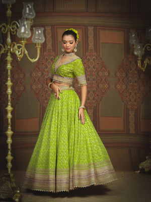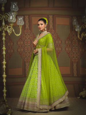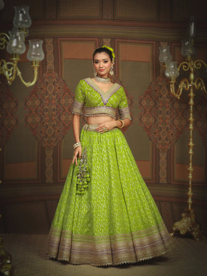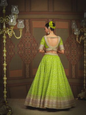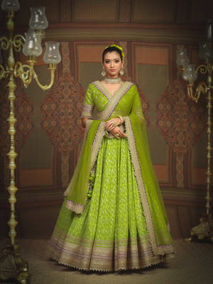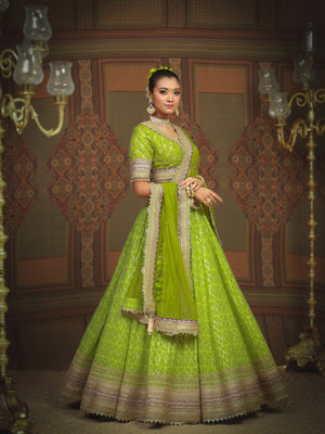 Embrace the burst of radiant charm with our Lemon green and Purple Cotton Shimmer chanderi lehenga, adorned with intricate Gota, Dori and Badla work. A delicate net dupatta elegantly drapes the lehenga, while the Silk Chanderi blouse, boasting a graceful V neckline adds a touch of sophistication. The captivating fusion of colors, embodies the essence of youthful exuberance and timeless grace.
