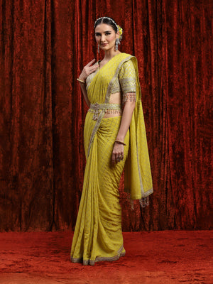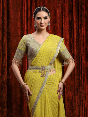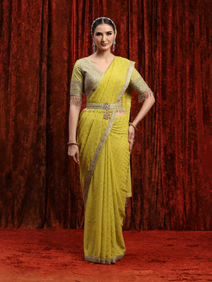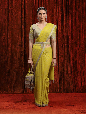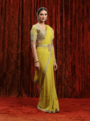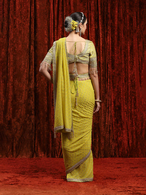Indulge in timeless elegance with our Georgette saree, a masterpiece of Lemon Green enriched with exquisite Gota, Dori and Badla work. The accompanying silk chanderi blouse, featuring a graceful V neckline, radiates charm and grace. Sarees have been an integral part of our culture for centuries, reflecting the rich tapestry of tradition. This ensemble embodies the essence of our cultural heritage while embracing the spirit of modernity.