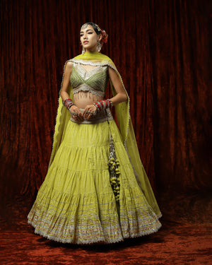 Featuring this Lemon Green Crinkle lahenga with fine gota work. It's paired with olive embroided blouse and dupatta.