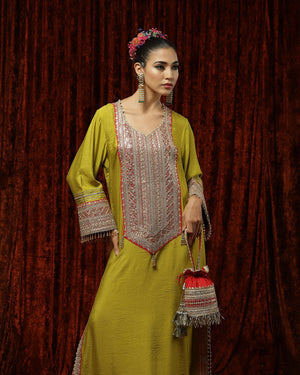 Featuring a Lemon Green & Rani Pink Kurta kaftan in Silk Chanderi and with fine gota, dori, badla work.
