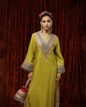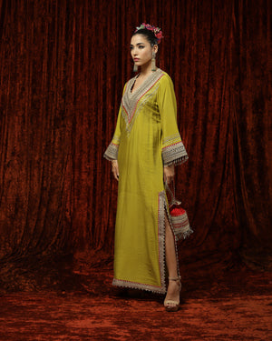 Featuring a Lemon Green & Rani Pink, Mehandi Green Kurta kaftan in Silk Chanderi and with fine gota, dori, badla work.
