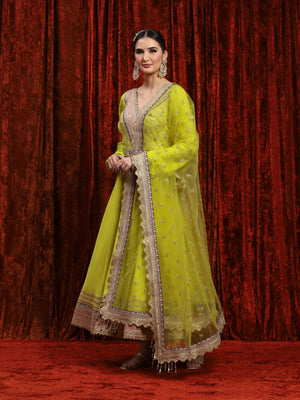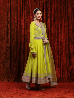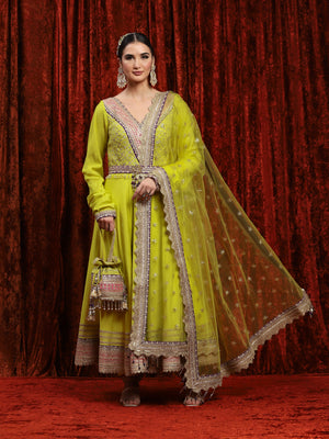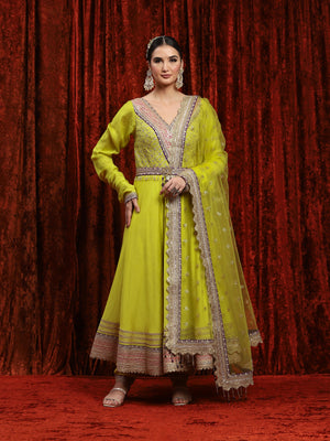 Immerse yourself in the opulent charm of our lemon green silk chanderi anarkali suit, accentuated with rani pink and purple color detailing for a modern twist. Embellished with exquisite gota, dori, badla and kasab work, this ensemble exudes opulence. Paired with a luxurious net duppata and churidar, it offers a complete traditional look. To elevate the silhouete, a belt feturing delicate tassel detailing cinches the waist, adding a graceful flourish to one's look.
