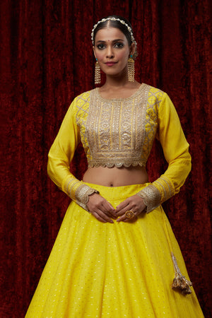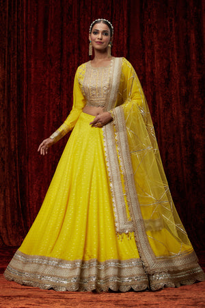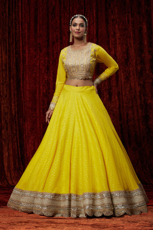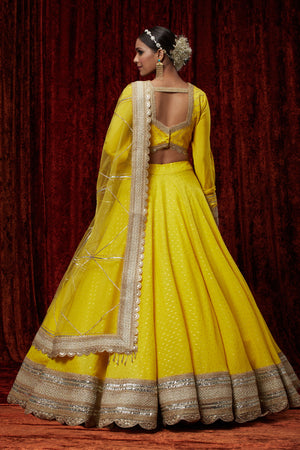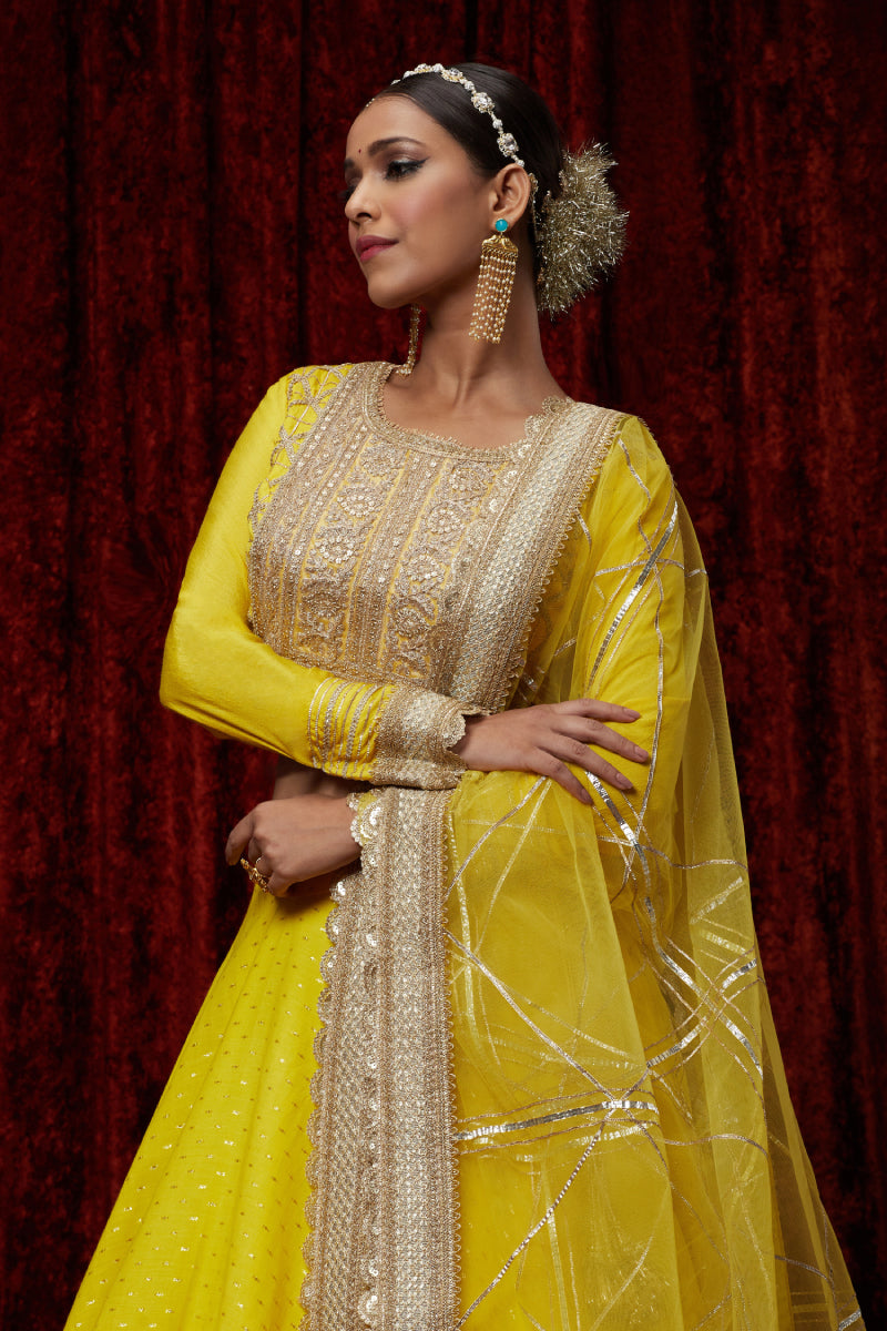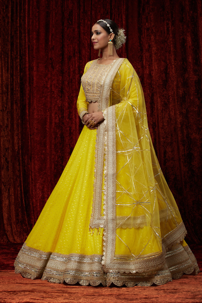 Featuring This Yellow Cotton Chanderi Lahenga With Fine Gota Work. It'S Paired With Embroided Chanderi Blouse And Net Dupatta.