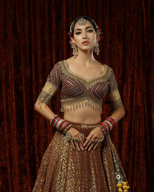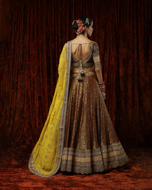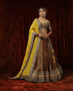 Featuring Lemon Maroon brocade lehenga highleted with fine gota and dori embroidery border. Comes with a matching blouse and yellow georgette dupatta.