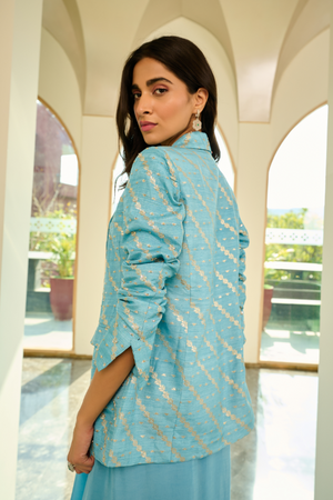 Powder blue drape skirt and raw silk bustier paired with embellished jamewar blazer