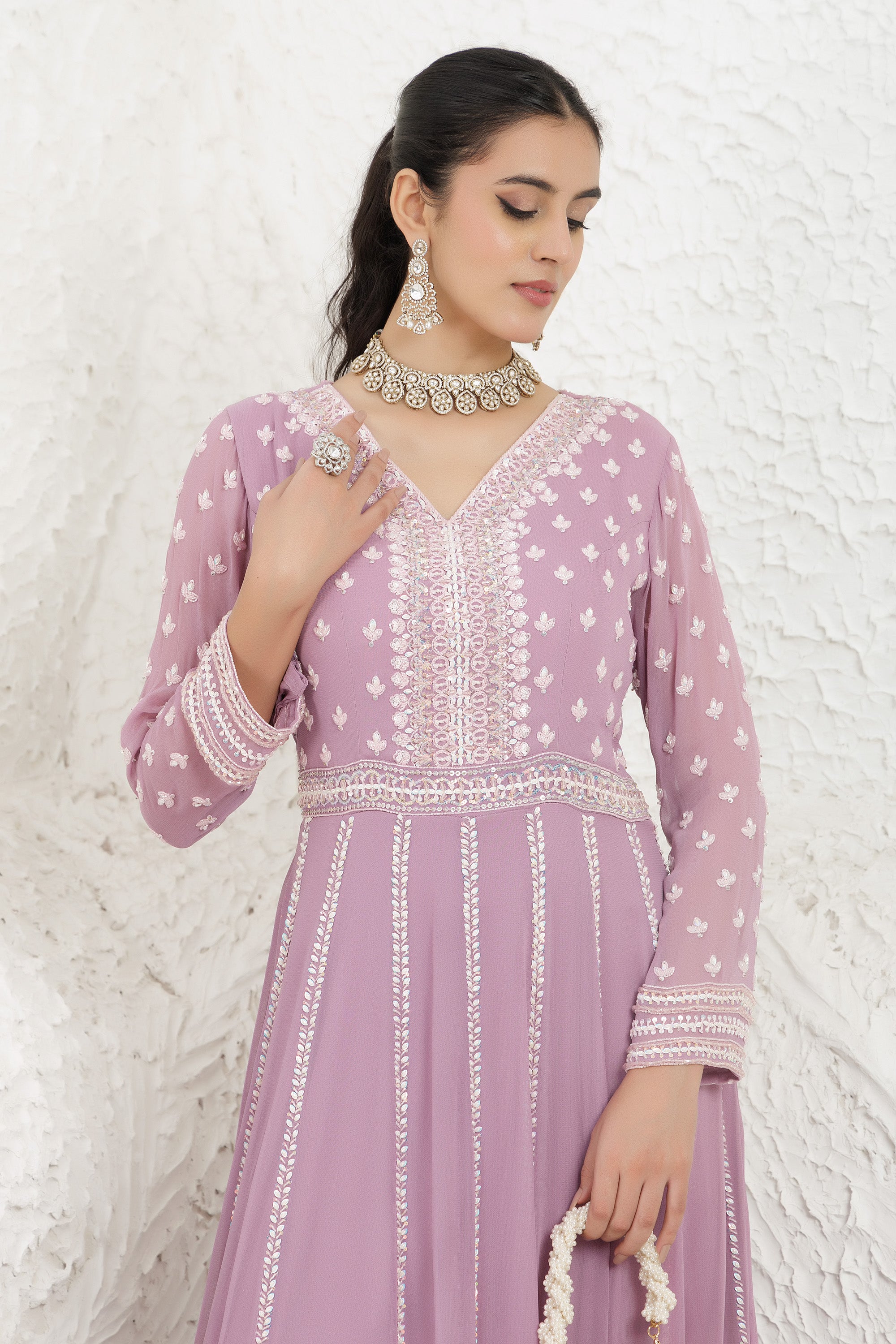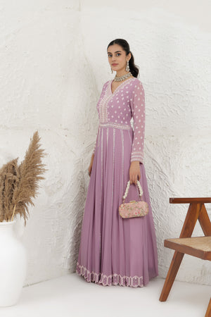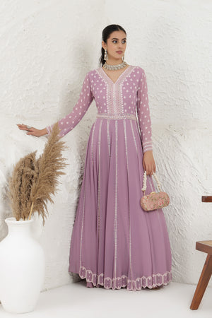 Levender gown in georgette base with cutdana, beads and sequins embroidery. Accentuate it with statement earrings and heels for a graceful look, perfect for festive gatherings or sangeet ceremony.