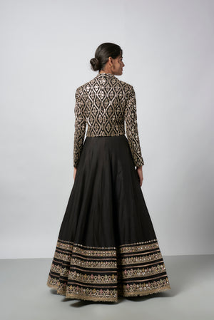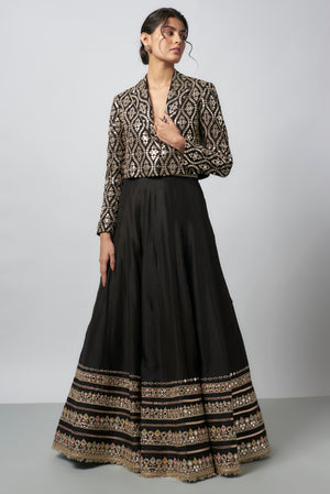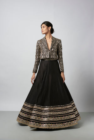 This set features a fitted full-sleeve jacket with geometric patterns, exuding elegance and sophistication. Paired with a voluminous black flared skirt featuring detailed metallic embroidery and mirror accents along the hemline.
