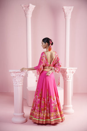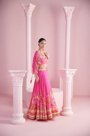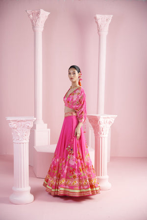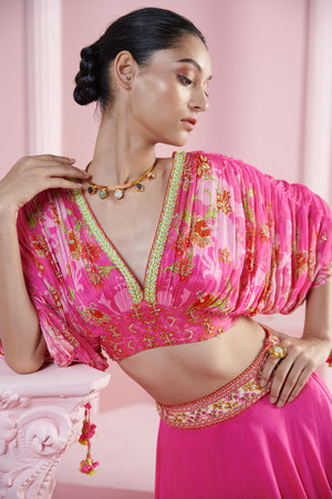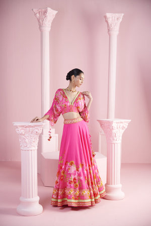 Embrace timeless elegance with the Pink Blossom Cluster Lehenga Set, a captivating ensemble perfect for special occasions. This set features a beautifully flowing lehenga adorned with delicate floral motifs in soft pink hues, creating a romantic and ethereal look. The draped blouse has intricate embroidery detail Paired with the lehenga is a stylish draped blouse, offering a modern twist with its graceful draping and flattering fit. The look is completed with a matching dupatta, accentuated by intricate embroidery on the belt, adding a touch of luxury and refinement. This set effortlessly combines traditional charm with contemporary design for a standout, sophisticated outfit.