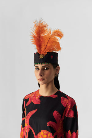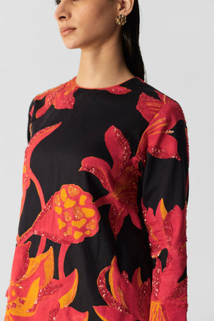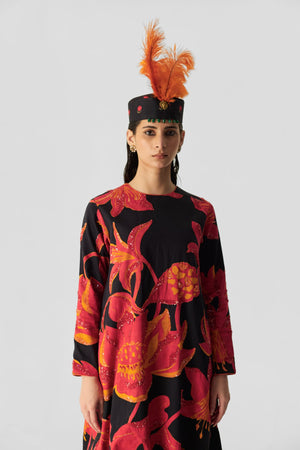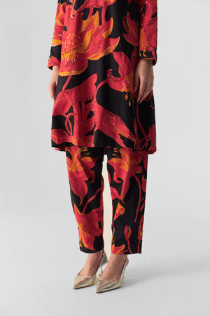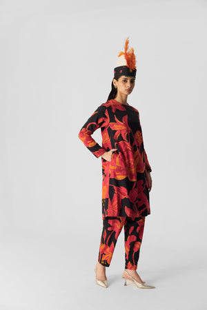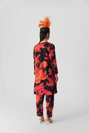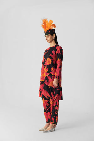 the exquisite Lian Kurta Set, featuring a stunning hand-painted floral print against a bold black backdrop. Crafted from luxurious cotton satin, this ensemble combines style and comfort seamlessly.