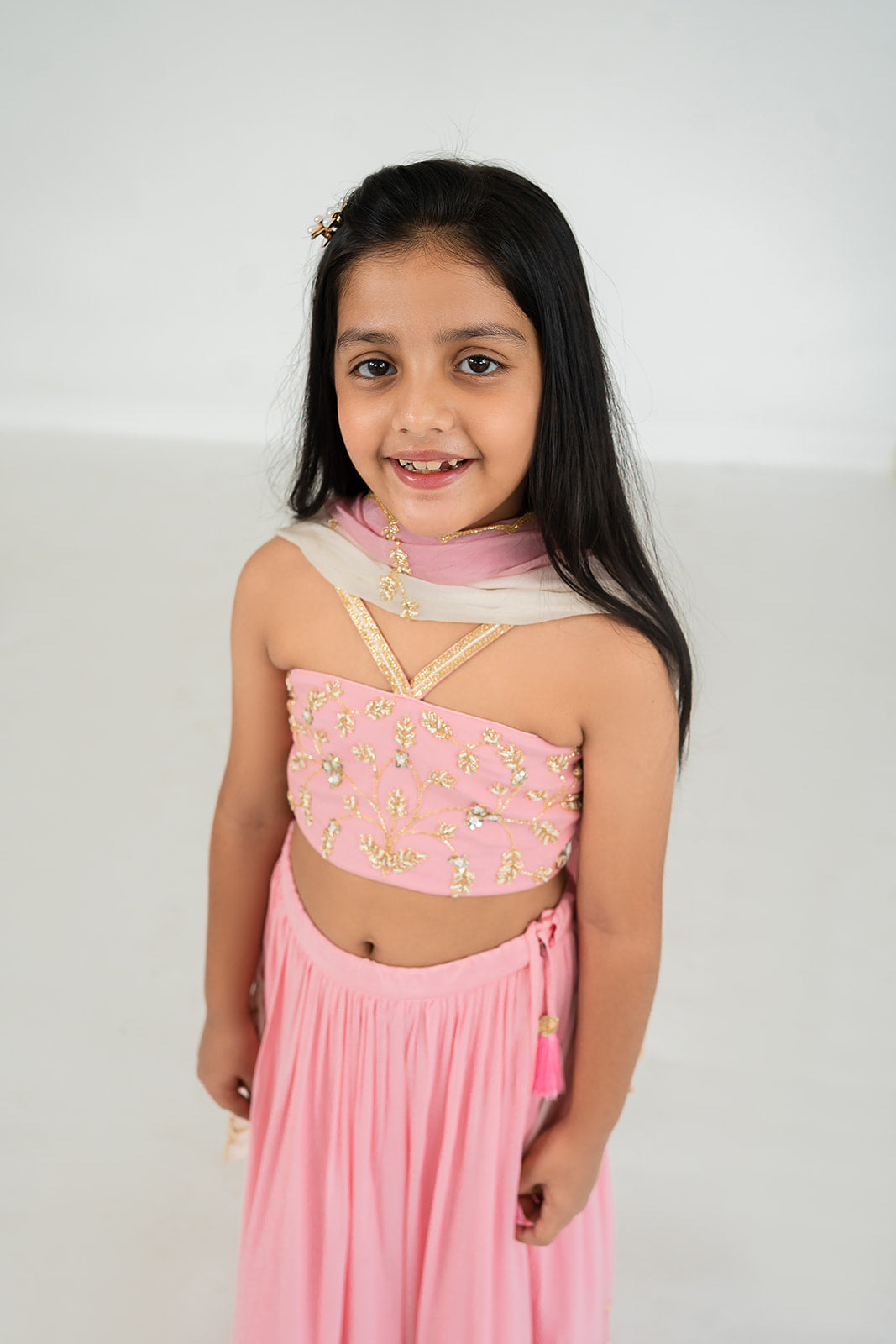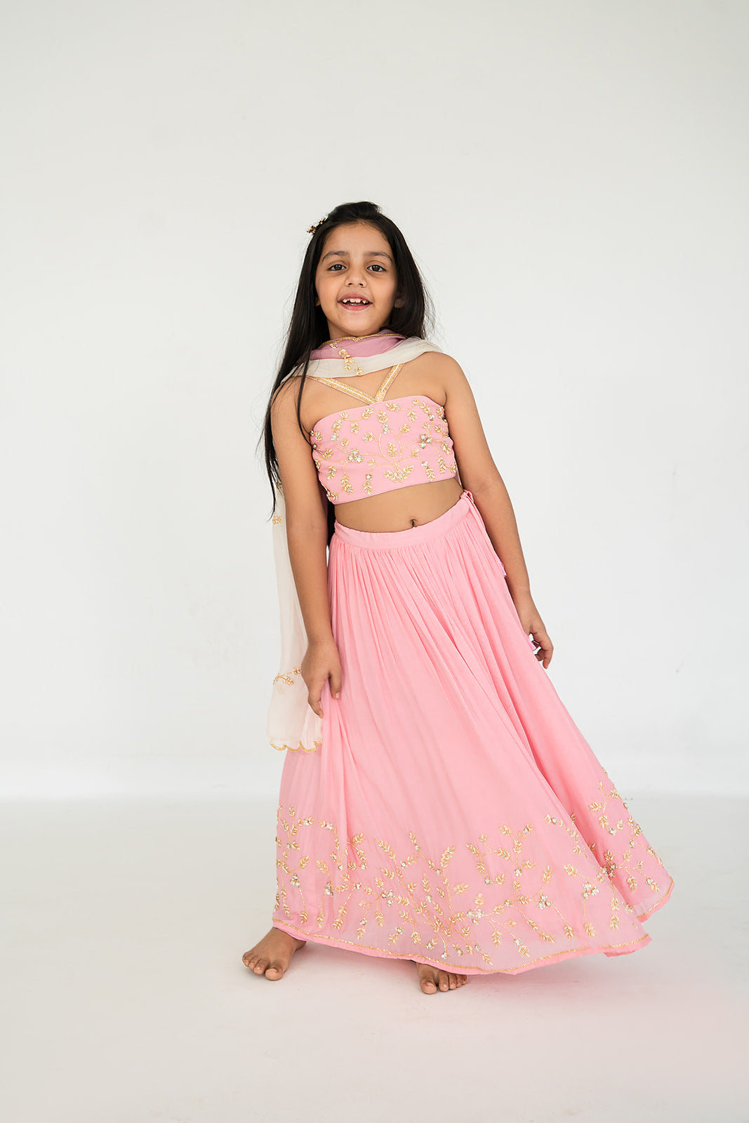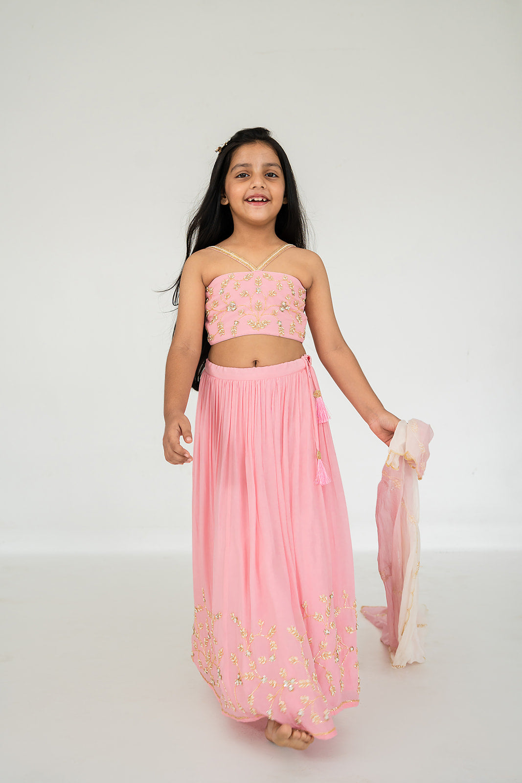 LIGHT BABY PINK EMBRODERED LEHENGA PAIRED WITH AN JAAL EMBROIDERED BLOUSE AND OMBRE DUPATTA