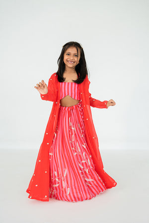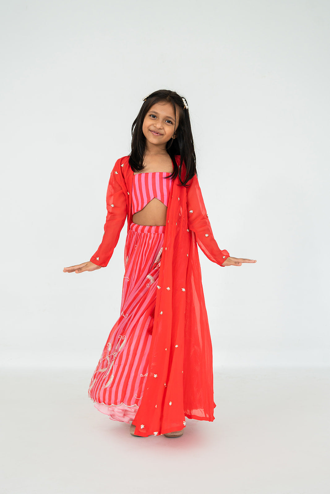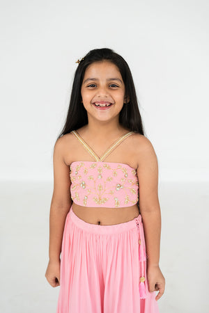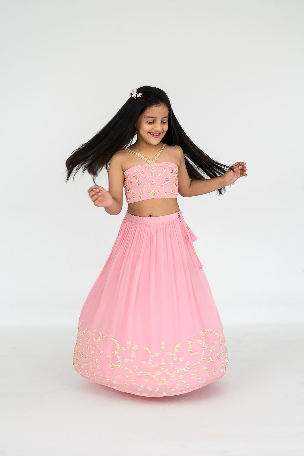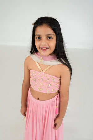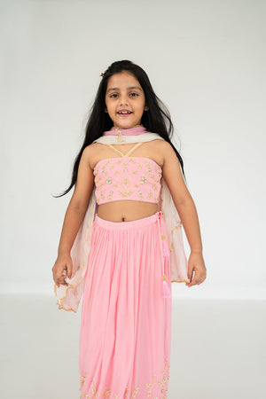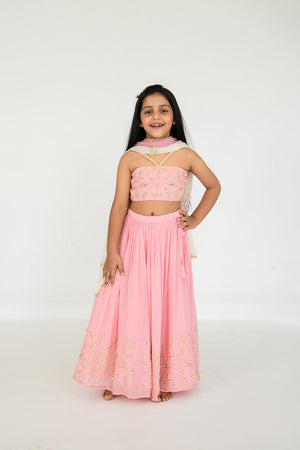 LIGHT BABY PINK EMBRODERED LEHENGA PAIRED WITH AN JAAL EMBROIDERED BLOUSE AND OMBRE DUPATTA
