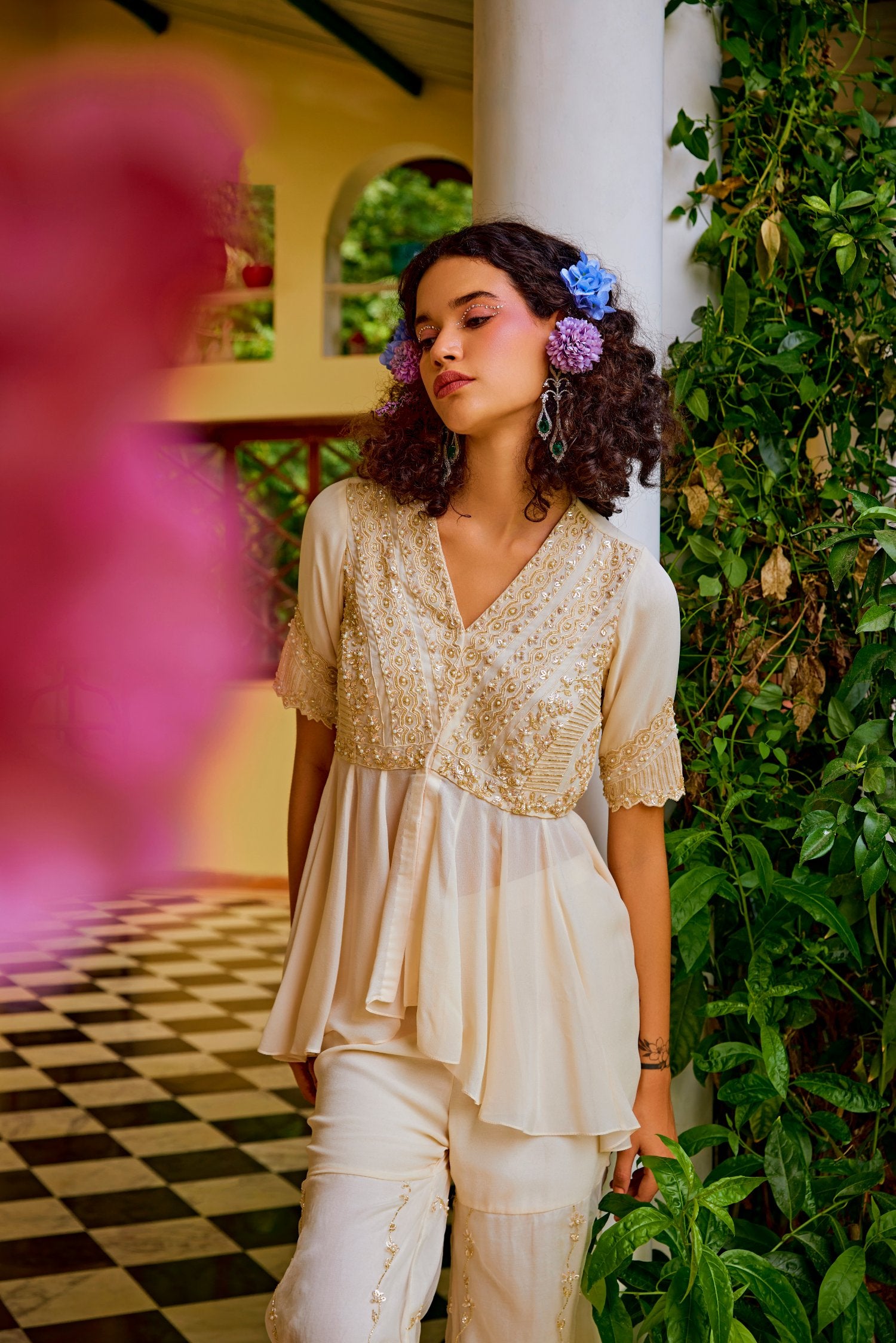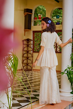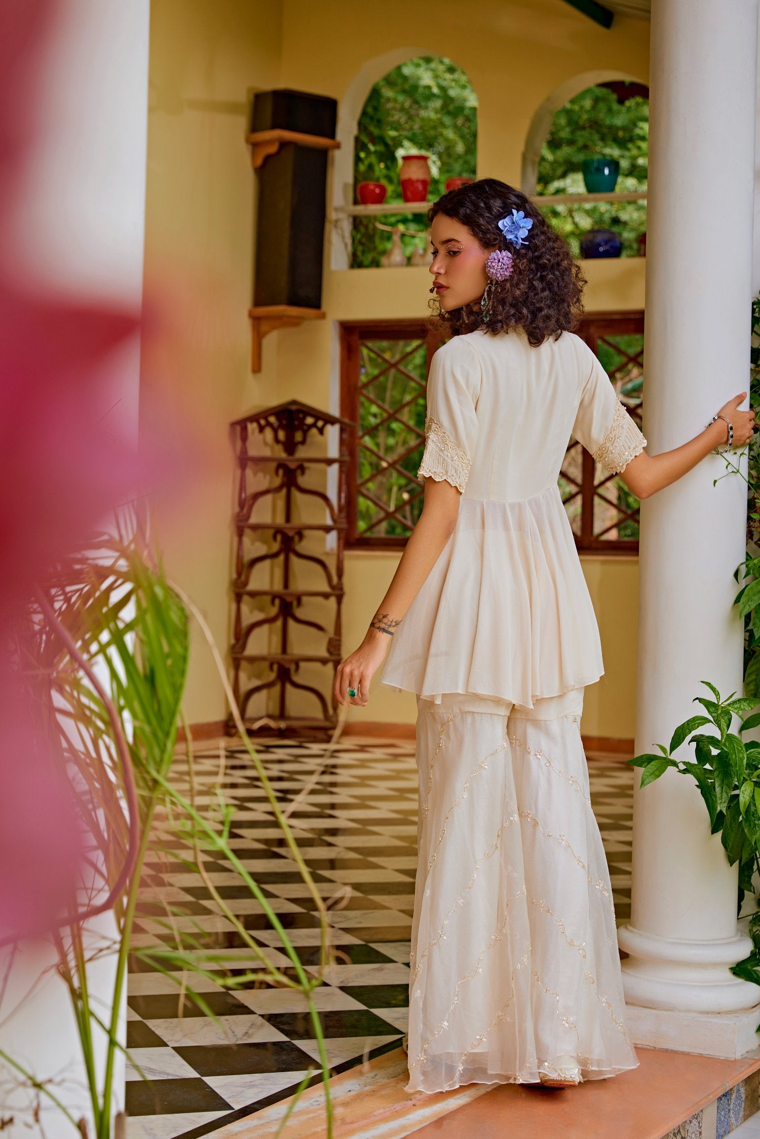 Our light beige organza sharara is adorned in exquisite sequin, katdana, and pearl embroidery. Paired gracefully with a satin organza short jacket featuring delicate embroidery, all complemented by an organza scalloped dupatta. This ensemble is designed for refined occasions, weddings, and upscale events, radiating a harmonious blend of tradition and contemporary sophistication. Elevate your style quotient with this opulent combination that captures the essence of elegance. Model Info: